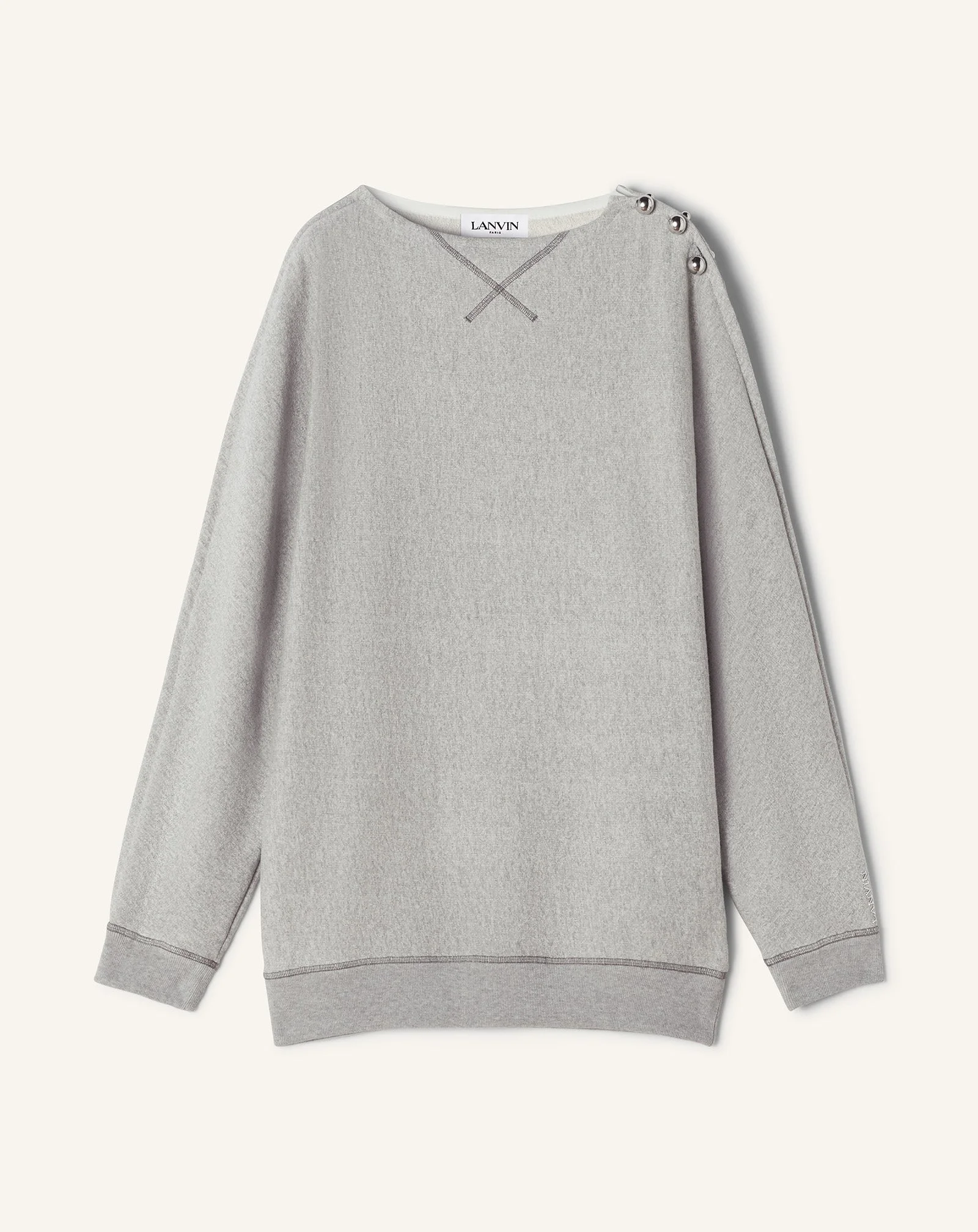 This collection features a jersey fabric crafted entirely from cotton, giving it a thick and substantial feel. The visible topstitching on this sweatshirt is inspired by embroidery found in the Maison's archives, while the cut and details are reminiscent of couture pieces. Details - Boat neck sweatshirt in mottled boucle jersey - Loose fit - Round shoulders - Ribbed cuffs and hem - Silver buttons at the neck - Topstitiching details - Embroidered Lanvin logo - Made in Italy Size & fit - For more information, please see our size guide. Composition - Main fabric : 100% cotton knitted - Lining : 100% cotton woven SKU: RW-TO0107-6161-H25100XS