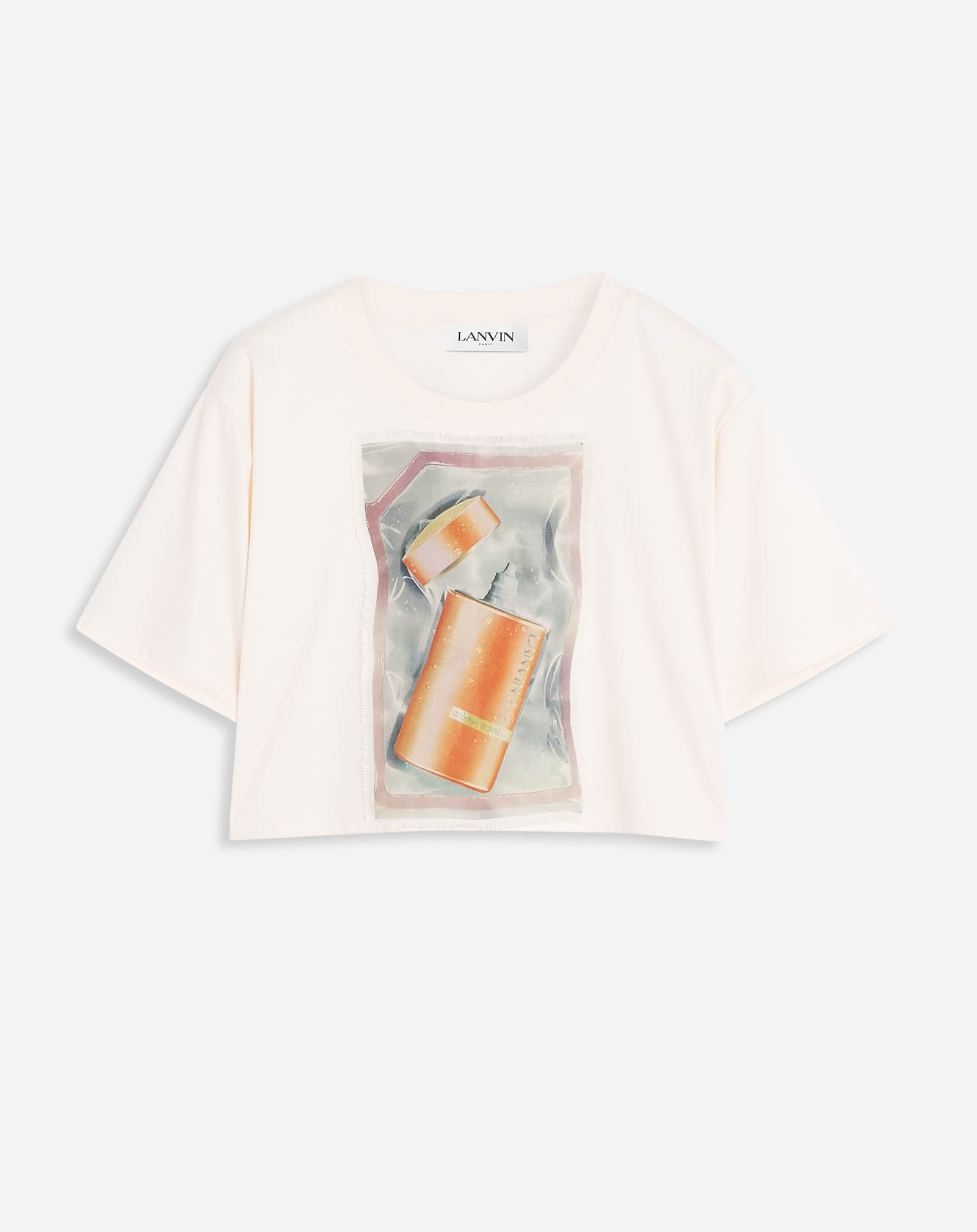 The Yorkshire-based artist, Anna Roberts, created this artwork in exclusivity for Lanvin. The ink used to print the artwork on the dress is scented to provide a multi sensorial experience. The technique used is named “scratch & sniff” and it can support up to 15 machine washes. Details - Cropped jersey Scratch & Sniff T-shirt - Sun Cream scented linen patch with raw hems - Color: pale pink - Made in Italy Size and fit - The model is 178 cm / 5'10'' tall - She wears a size S Composition - Main material: 100% cotton - Patch: 100% linen Cleaning and care - Turn inside out before cleaning - Do not iron the embroidery SKU: RW-TS0012-J006-E2351L