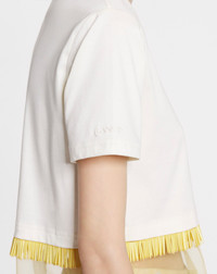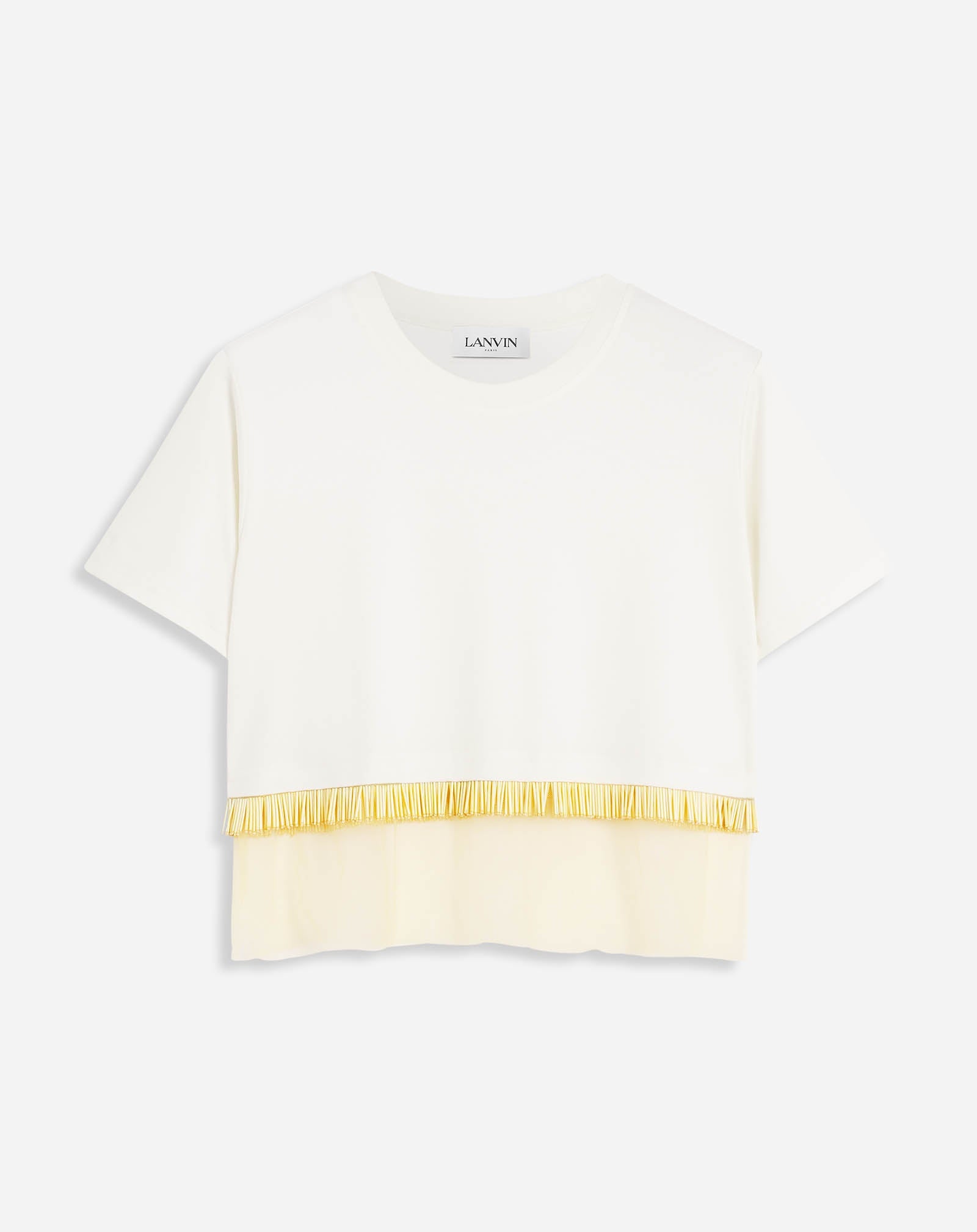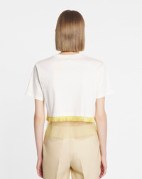 Details - Classic cotton jersey T-shirt with a visible lining effect in tulle and embroidery - Tone-on-tone Lanvin logo embroidery on the sleeve - Color: milk - Made in Portugal Size and fit - The model is 178 cm / 5'10'' tall - She wears a size S Composition - Main material: 100% cotton - Material 2: 100% nylon - Embroidery: 100% glass Cleaning and care - Turn inside out before cleaning - Do not iron the embroidery SKU: RW-TS9012-J010-E23012L