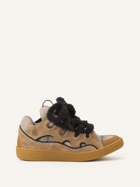 The '90s-inspired Curb sneaker features an assertive design and an exaggerated silhouette. Its sophisticated construction is characterized by the ultimate in comfort, thanks to its round shape, padded tongue, and metal eyelets. This collection features a herringbone woven suede and cotton version of Curb's iconic motif, with extra-wide mesh laces. Details - Curb sneakers in suede and herringbone woven cotton - Extra-wide tubular mesh laces with plastic tips - Padded tongue with the Lanvin label - Mother and Daughter logo embossed on the side - Made in Portugal Size & fit - This style fits true to size, you may take your usual size. - The size displayed corresponds to a French size SKU: FU-SKDK12-TISS-H250535