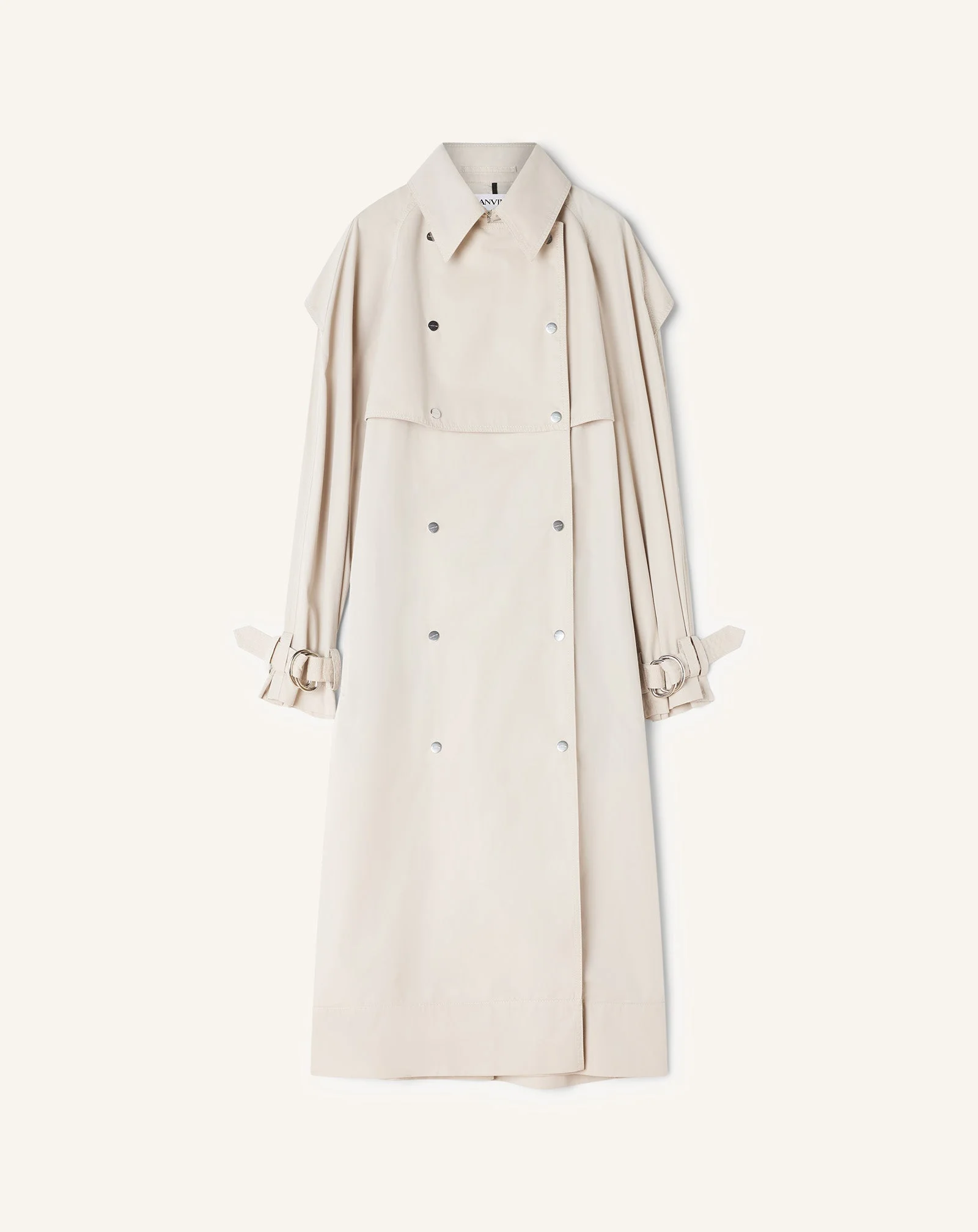 This trench coat, inspired by the volumes of the 1920s Car Coat, one of the first unisex pieces in modern history, pays tribute to Jeanne Lanvin, one of the first couturiers to play with the codes of men's clothing for women. The triangle on the back is inspired by the geometric mosaic in her bathroom and is enhanced with topstitching on the waistband and cuffs, an embroidery technique she developed to structure the feminine silhouette. The technical cotton fabric is lightweight and ideal for an elegant, casual mid-season daytime wear. Details - Cotton trench coat - Removable belt - Triangular-shaped lower panel - Round shoulders - Tapered cuffs - Double-breasted with snap buttons and a hook-and-eye fastening - Side pockets - Made in Italy Size & fit - This style fits true to size, take your normal size - For more information, please see our size guide. Composition - Main fabric : 67% cotton woven,33% polyamide woven - Lining : 100% cotton woven SKU: RW-CO0014-6240-P2601334
