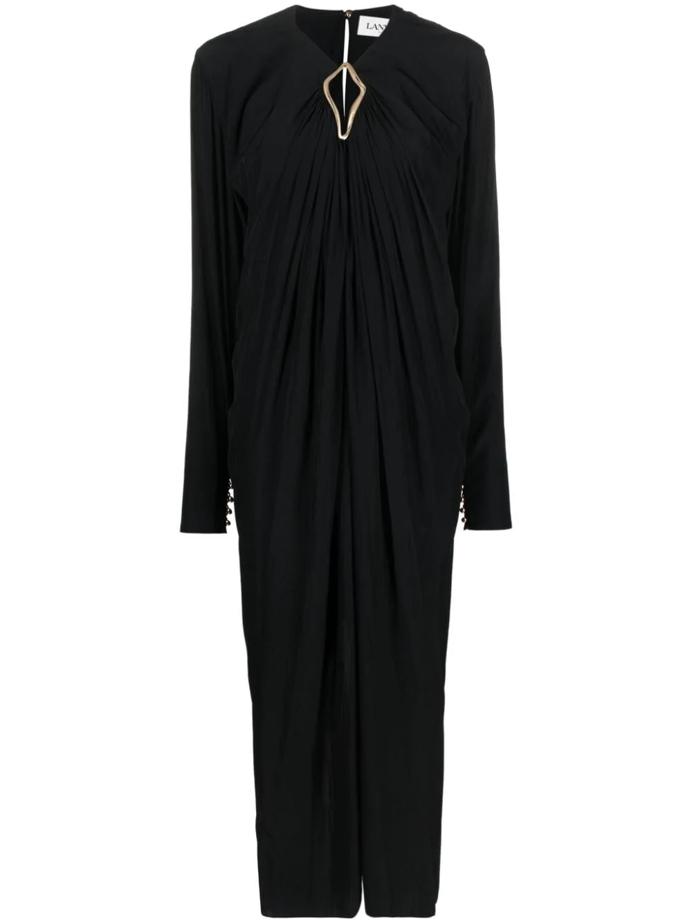 draped midi dress Lanvin's rich design heritage is on full show with this black dress. It's cut from signature charmeuse to a softly draped silhouette that's punctuated with gold-tone hardware at the chest: a brand hallmark that appears throughout its collections. Highlights - Black - Gold-tone hardware - Cut-out detailing - Gathered detailing - V-neck - Long sleeves - Buttoned cuffs - Rear slit - Calf-length Made in France Composition Polyester 100% SIZE & FIT Model measurements Height 5 ft 11 in(1.8 m) Bust/Chest 31.49 in(80 cm) Hips 36.22 in(92 cm) Waist 25.59 in(65 cm) FittingInformation Designed to be unstructured, offering a loose fit throughout The vented hem offers movement at the rear Made from a midweight non-stretch fabric This piece fits true to size – take your usual size Washing instructions Dry Clean Only