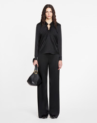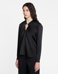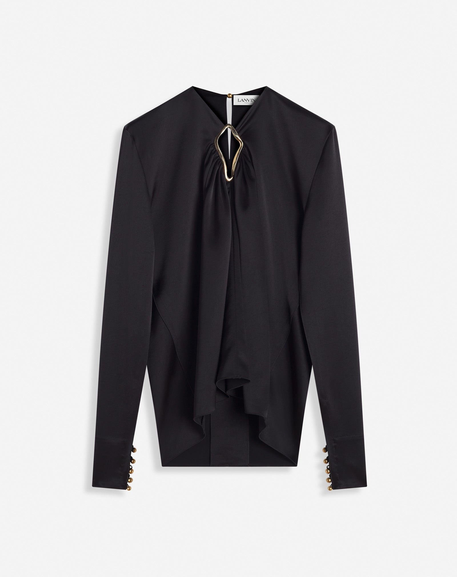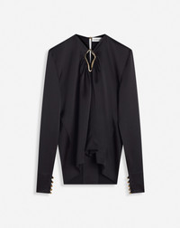 Certain pieces in this collection feature Lanvin's emblematic eyelet detailing. This detail adds a touch elegance to the designs, while paying tribute to the iconic legacy of the House. Details - Draped satin top with eyelet detail. - Eyelet opening at the center of the neckline - Structured shoulders - Long ruffled sleeves - Button closure at the back - Color: black - Made in France Size and fit - This style fits true to size, take your usual size. - For more information, please see our size guide. Composition - Main fabric: 63% triacetate, 37% polyester - Lining: 73% cellulose acetate ,27% silk Cleaning and care - All our items are shipped in a luxurious Lanvin gift box done in the colors of the brand. - At Lanvin, we take great care to ensure we only select the finest materials. Please check the care label on your ready-to-wear item before proceeding with any cleaning. - If you have a question or concern, please contact our customer service department or visit one of our stores, where our staff will be happy to assist you and provide you with more information about our services. SKU: RW-TO0004-5822-H231036
