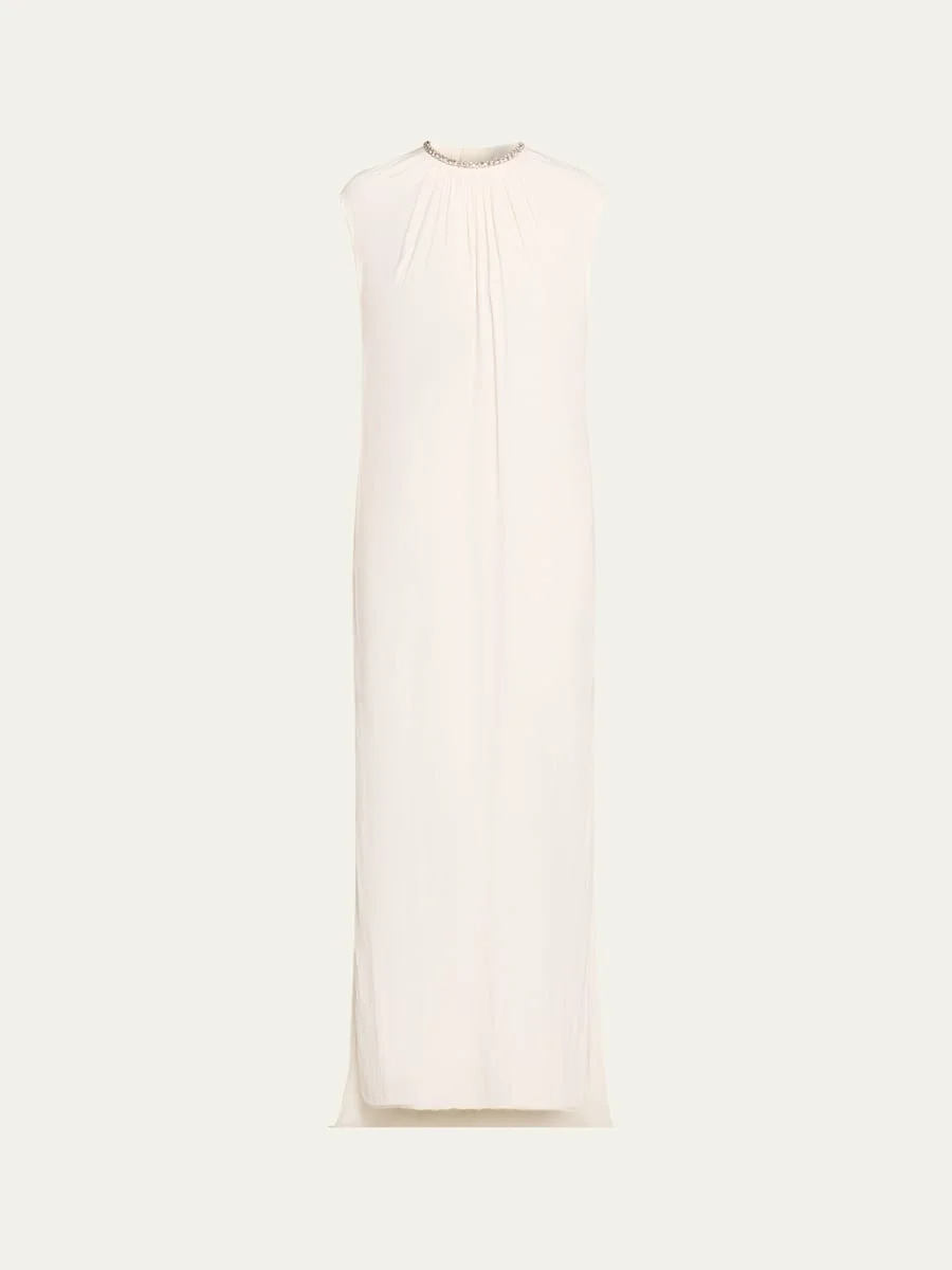 Characterized by fluidity and gentle gathers, this woven charmeuse gown from Lanvin features a collar and back with handembroidered crystals. High round neckline Sleeveless Side slip pockets Vented sides Floorlength hem Column silhouette Back zip closure Polyester/viscose Dry clean Imported SIZE amp; FITModel measurements: 5'10" tall Model is wearing a US size 4/Small