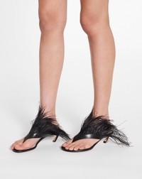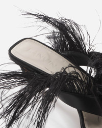 With a name inspired by jazz, the Swing line pays tribute to Jeanne Lanvin's passion for music. These ostrich feather sandals are essential for any chic wardrobe. Details - Feather Swing sandals in leather - Color: Black - Made in Italy Size and fit - Toe-post sandals with ostrich feathers - Curved Swing heel - Heel height: 45 mm (1.8 in.) Composition - Main material: calfskin - Secondary material: ostrich feathers - Lining: goatskin leather - Sole: calfskin Cleaning and care - Gently wipe the leather part only with a soft, dry cloth. - Store in a dry, dark place in their original packaging. SKU: FW-SASS0H-PLUM-E231036