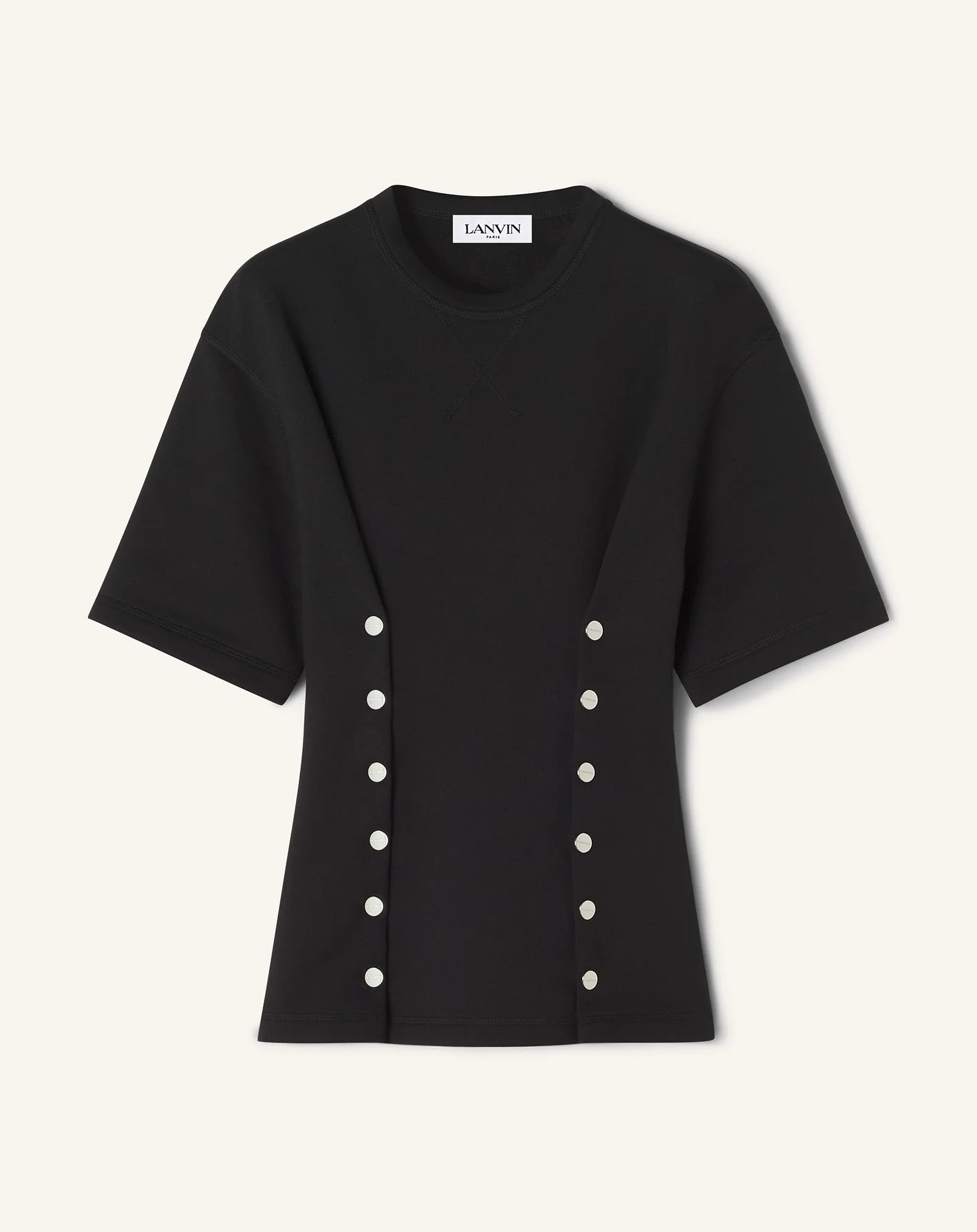 This collection features a new high-quality fleece fabric that combines the comfort of cotton with the sophistication of cashmere. Its cut is inspired by couture pieces, and its details, such as the snap buttons, add a contemporary touch to the silhouette. Details - Fitted cotton and cashmere T-shirt - Round neck - Snap buttons on the front - Made in Italy Size & fit - For more information, please see our size guide. Composition - Main fabric : 90% cotton knitted,10% cashmere knitted SKU: RW-TS0016-F045-H2510XS
