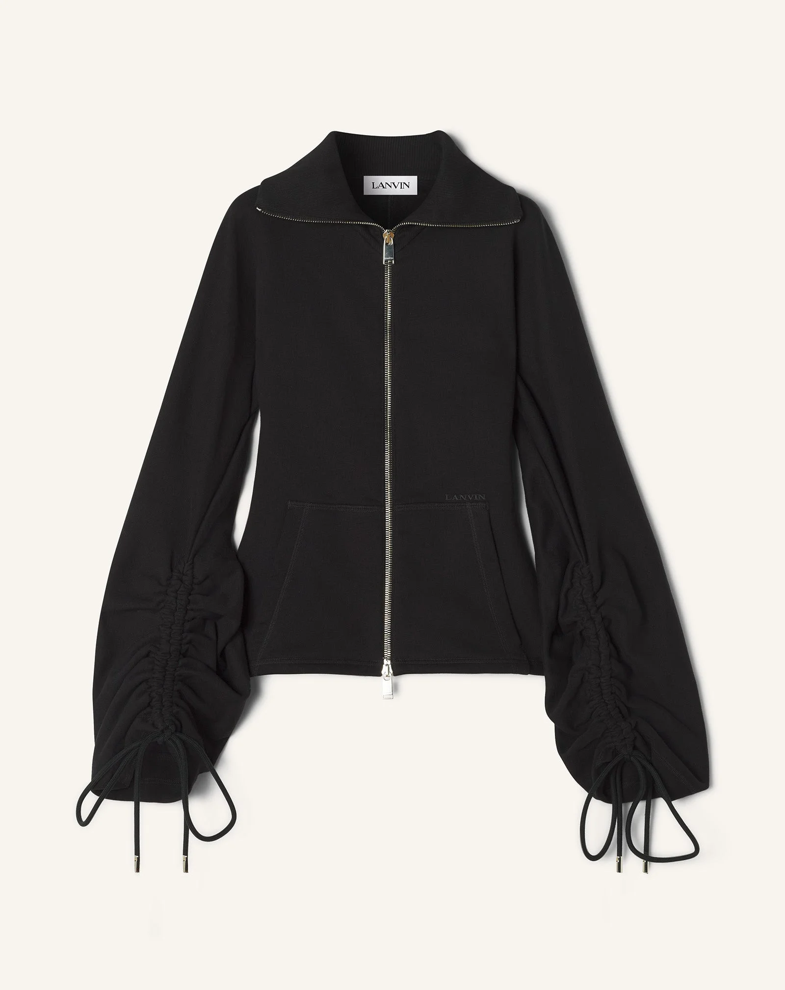 >This collection features a new high-quality fleece fabric that combines the comfort of cotton with the sophistication of cashmere. The topstitching details on this jacket are inspired by embroidery in the Maison's archives, while its cut and proportions are reminiscent of couture pieces. Details - Fitted zip jacket in cotton and cashmere - Gathered drawstring cuffs - Metal zipper closure - Two kangaroo pockets in front - Embroidered Lanvin logo - Ribbed collar - Made in Italy Size & fit - For more information, please see our size guide. Composition - Main fabric : 90% cotton knitted,100% polyester knitted,10% cashmere knitted,100% polyester knitted - Lining : 100% cotton woven SKU: RW-JA0015-F045-H2510XS