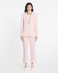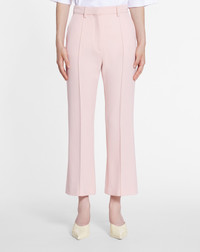 These pants are made from an elegant couture wool with a fine powder-grain structure, a Japanese weaving technique. The fabric has a light resin finish that creates a modern, flowing look. They can be worn with the matching jacket. Details - Flared cropped pants in woven wool - Permanent topstitched crease at mid-leg - Slanted Italian pockets - Ankle length - Square buckle in the middle of the back - Grosgrain waistband - Bone buttons - Made in Italy Size & fit - For more information, please see our size guide. Composition - Main fabric : 100% wool woven - Lining : 100% viscose woven SKU: RW-TR0114-5859-P2452034