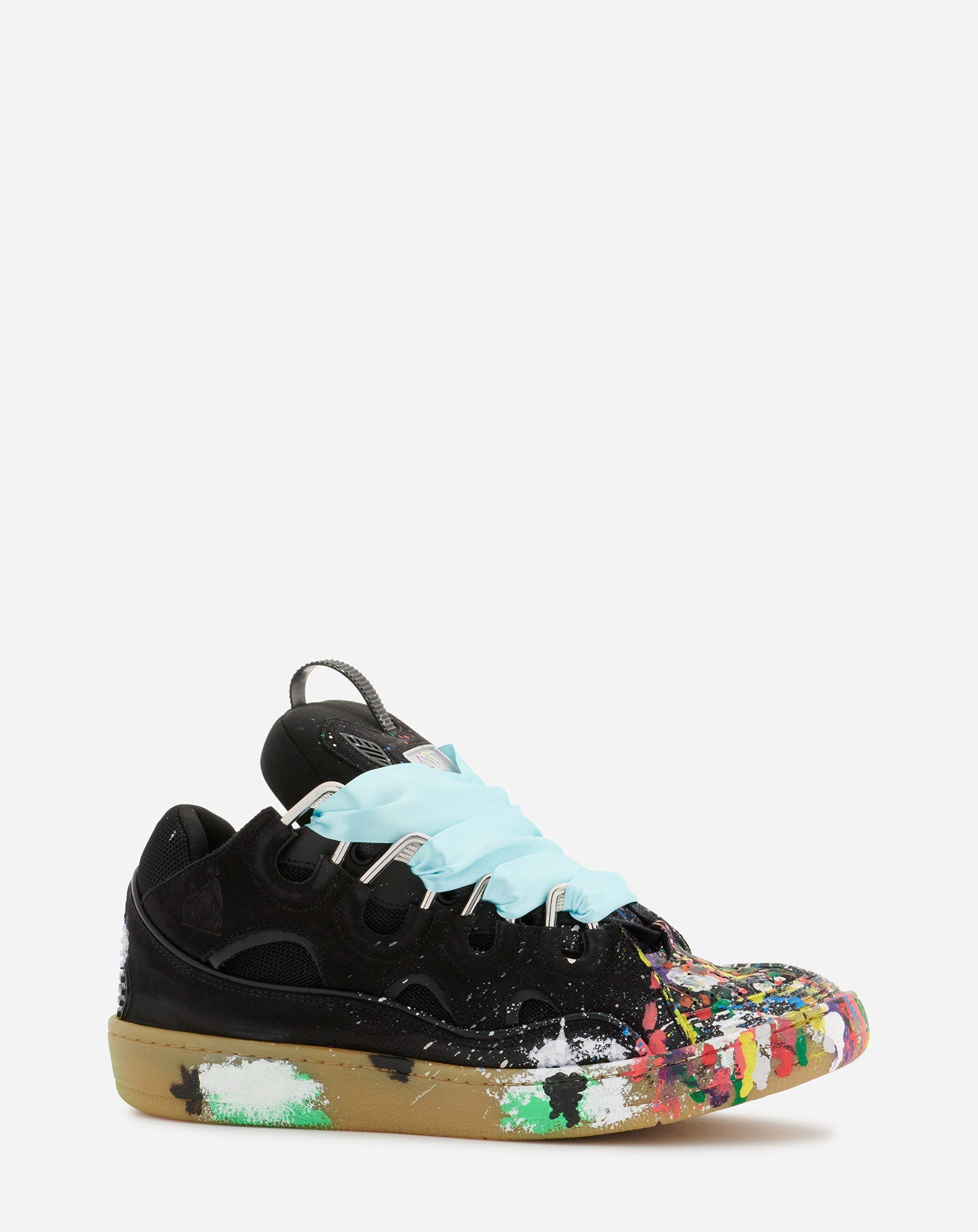 The Curb is a sneaker inspired by the 90s, with a confident design and exaggerated dimensions. Made in nappa calfskin, suede and mesh, this elaborately constructed shoe stands out for its extraordinary comfort thanks to the rounded shape, padded tongue, and curved metallic eyelets. Details - Gallery Dept. x Lanvin Curb sneakers, in hand-painted calfskin leather, personalized by artist Josué Thomas - Colors: black, multicolored - Quilted tongue with Lanvin label and embossed Mother and Child logo - Mismatched double waxed satin laces - Made in Portugal Composition - Main material: mesh - Secondary material: calfskin - Third material: nubuck - Sole: rubber Cleaning and care - Fragile motif. Do not use products for cleaning. Avoid contact with water. - Store in a dry, dark place in its original packaging. SKU: FW-SKDK02-DRGD-P2210S135