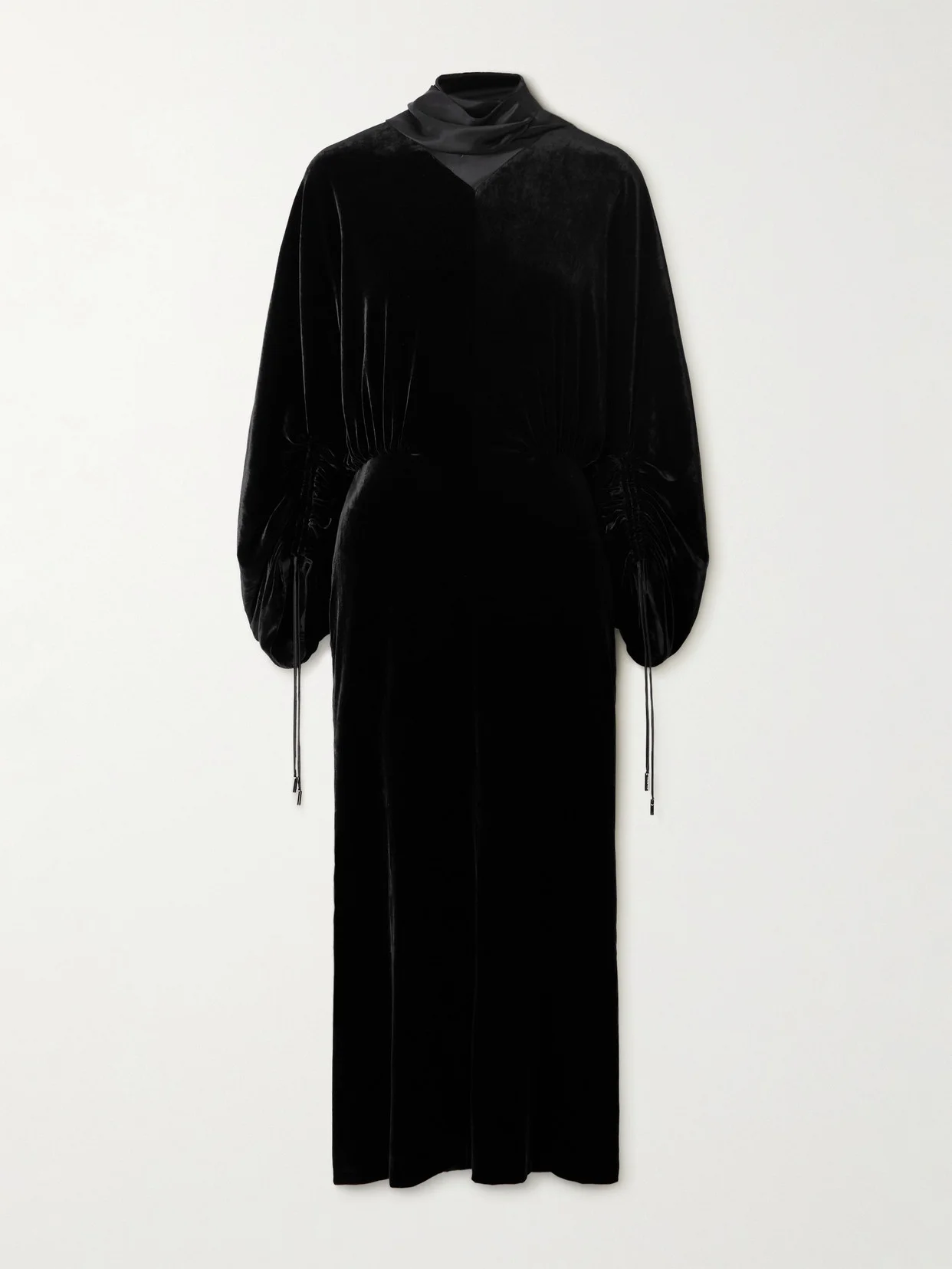 Scarf-detailed Satin-trimmed Velvet Midi Dress