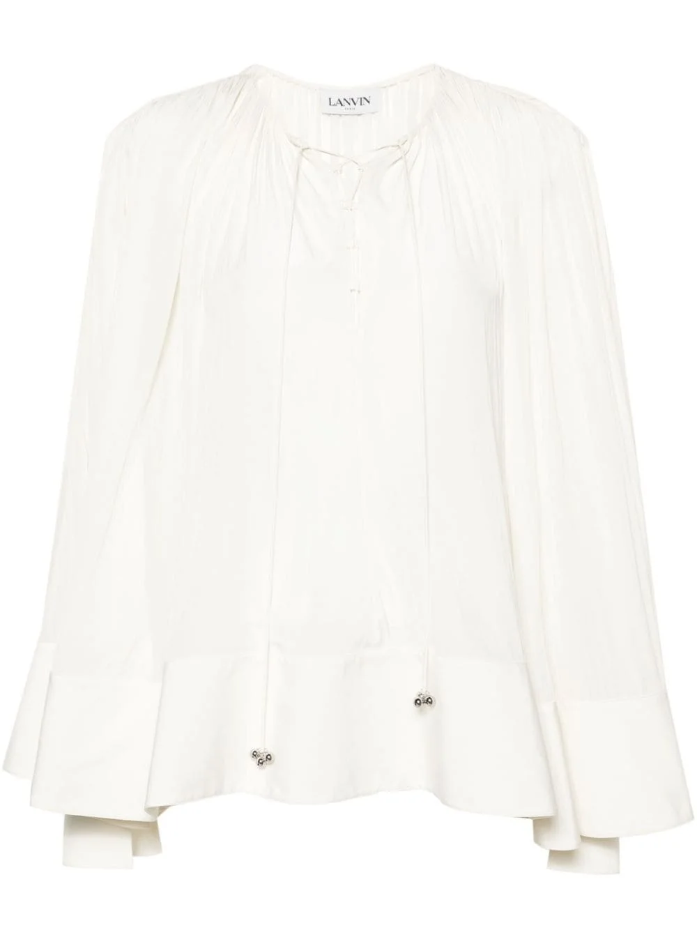 gathered drop-shoulder kaftan Highlights - Ecru - Semi-sheer construction - Gathered detailing - Front tie fastening - Drop shoulder - Long sleeves - Buttoned cuffs - High-low hem Imported Composition Polyester 100%, Brass 100% SIZE & FIT Model measurements Height 5 ft 10 in(1.77 m) Bust/Chest 33.07 in(84 cm) Hips 37 in(94 cm) Waist 24.8 in(63 cm) FittingInformation Designed to be unstructured, offering a loose fit throughout The adjustable drawstring means that you can adjust this piece’s fit to suit your comfort and preference Made from a midweight non-stretch fabric This piece fits true to size – take your usual size