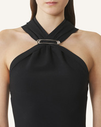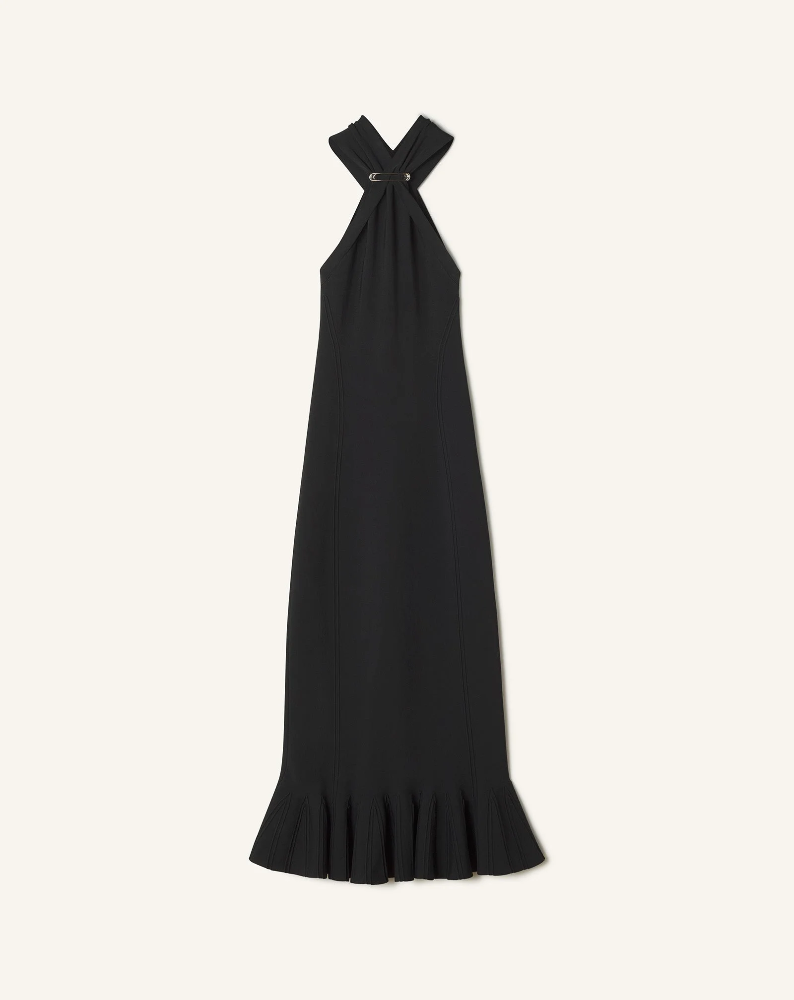 This dress is crafted from a fluid, compact viscose fabric that perfectly molds to the body's contours. The design details elevate the piece and feature a brooch at the neckline and ruffles at the hem. Details - Long dress in compact viscose - Tailored fit - Sleeveless racerback design - Lanvin signature brooch at the draped neckline - Slip-on - Made in Italy Size & fit - This style fits true to size, take your normal size - For more information, please see our size guide. Composition - Main fabric : 83% viscose knitted,17% polyester knitted SKU: RW-DR0086-K068-H2510S