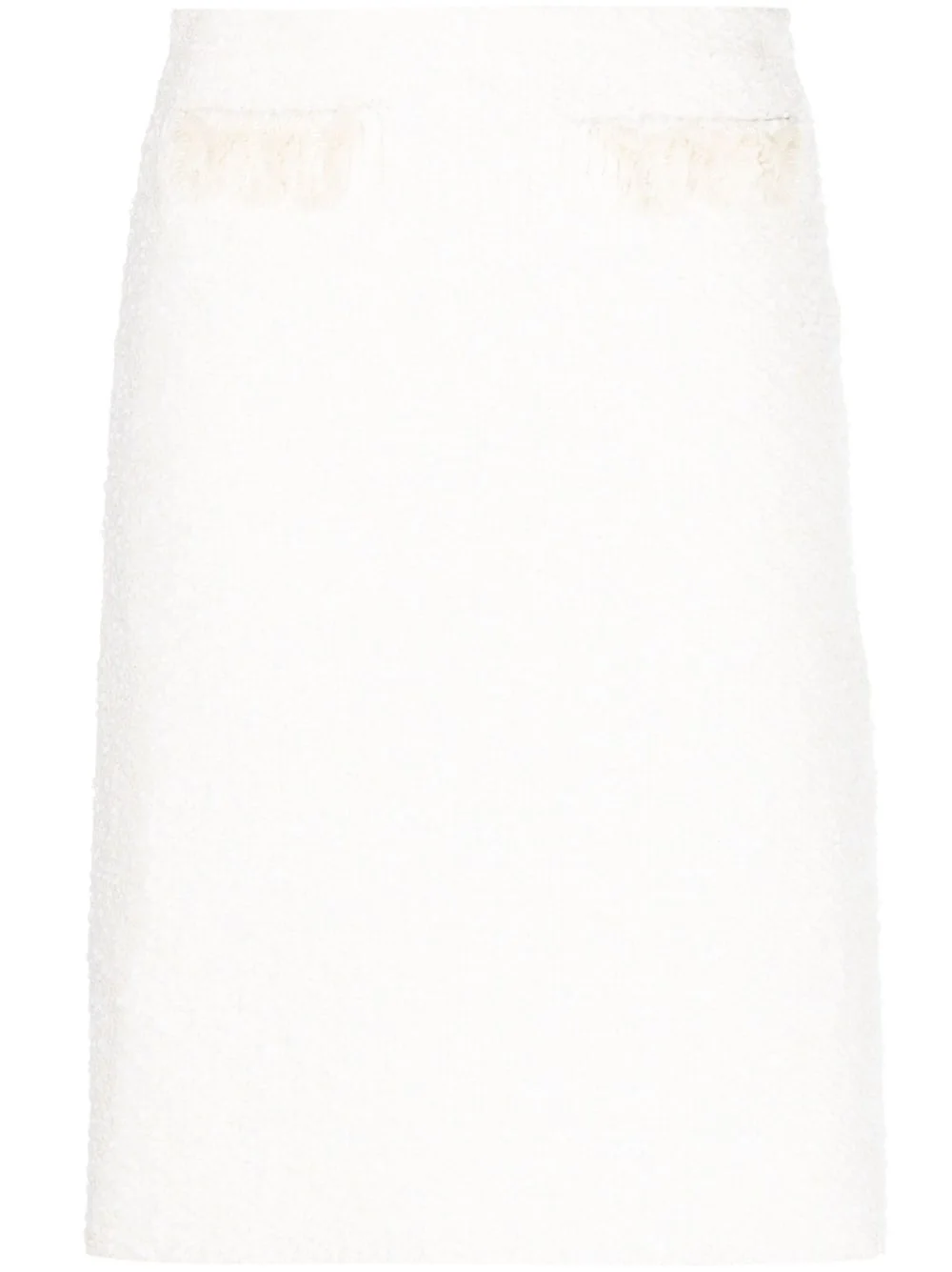 high-waisted straight skirt ecru cotton high waist textured finish embroidered design Made in Italy Composition glass 100%, Cotton 49%, Viscose 25%, Polyamide 23%, Virgin Wool 3% SIZE & FIT Model measurements Height 5 ft 11 in(1.8 m) Bust/Chest 31.49 in(80 cm) Hips 35.43 in(90 cm) Waist 24.4 in(62 cm) FittingInformation This mini-length skirt is intended to be worn high on the waist Made with a midweight knit, this piece offers some stretch This piece fits true to size – take your usual size Washing instructions Dry Clean Only