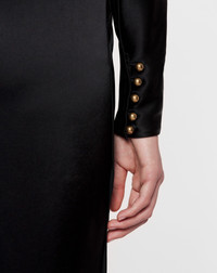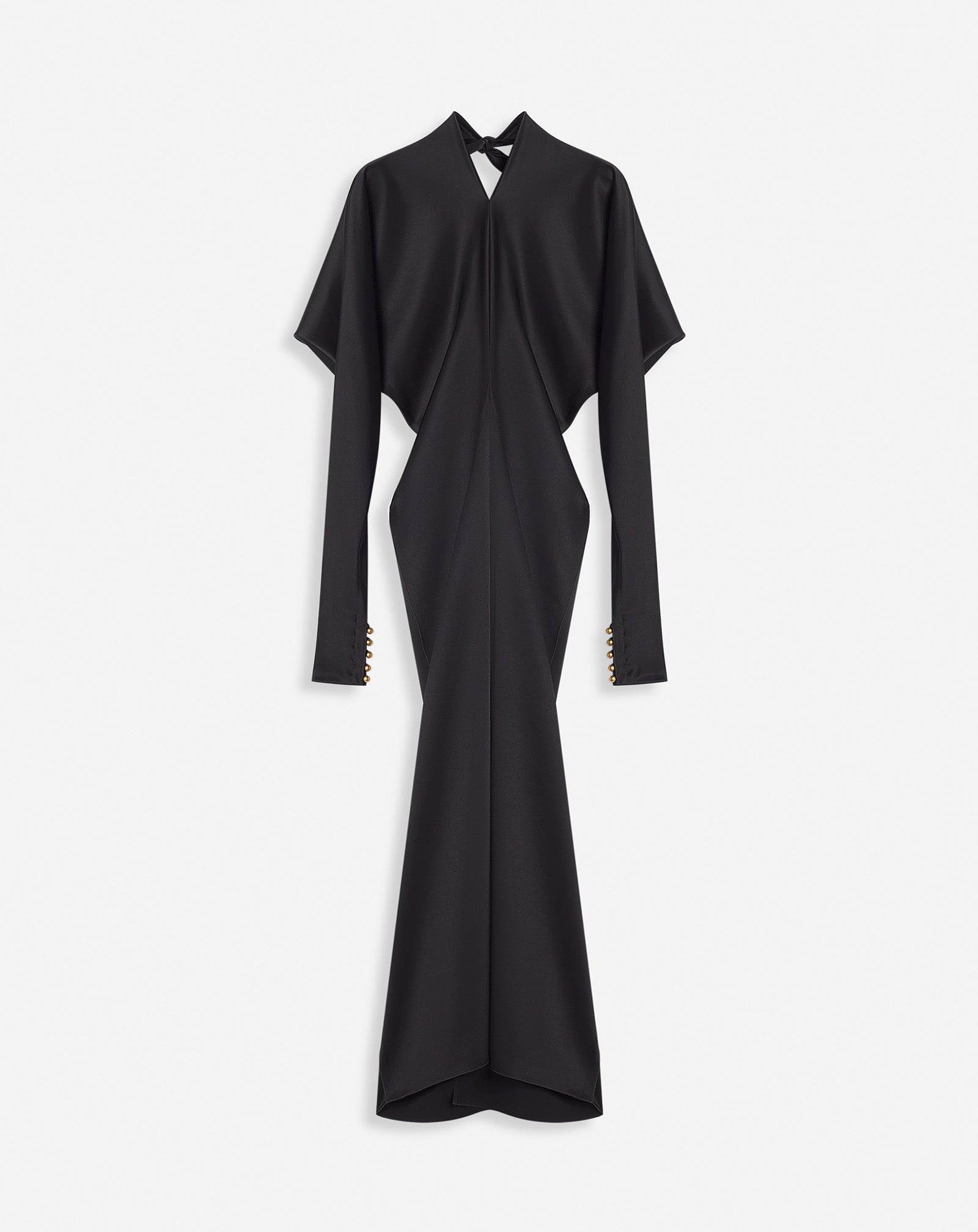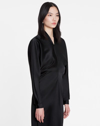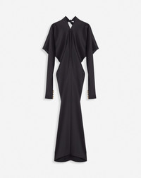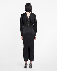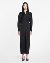 With its flowy satin fabric and kimono sleeves, this dress embodies the elegance of the Lanvin woman. Details - Satin kimono-sleeve midi dress - Mid-length dress with flowy fitted cut - Crew neck - Kimono sleeves tightened at the wrists - Round shoulders - Concealed back zipper closure - Ball buttons - Long skinny scarf at the back - Color: black - Made in Spain Size and fit - This style fits true to size, take your usual size. - For more information, please see our size guide. Composition - Main fabric: 63% triacetate, 37% polyester Cleaning and care - All our items are shipped in a luxurious Lanvin gift box done in the colors of the brand. - At Lanvin, we take great care to ensure we only select the finest materials. Please check the care label on your ready-to-wear item before proceeding with any cleaning. - If you have a question or concern, please contact our customer service department or visit one of our stores, where our staff will be happy to assist you and provide you with more information about our services. SKU: RW-DR0018-5822-H231036