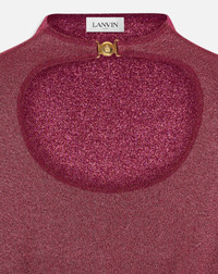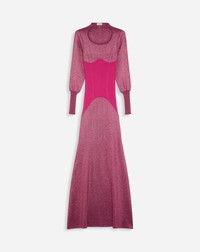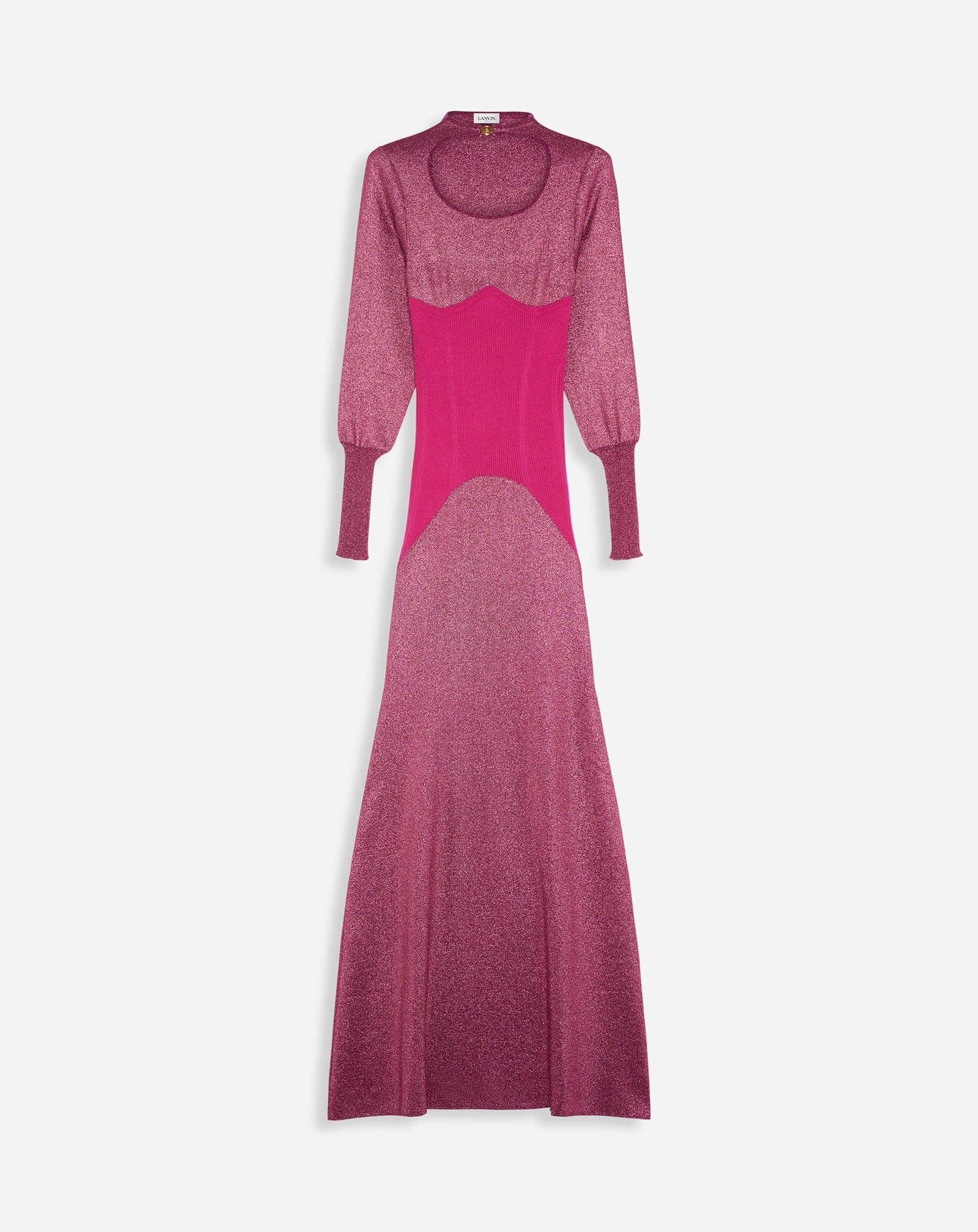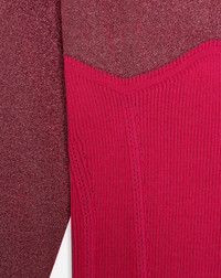 Details - Long finely ribbed fitted dress in cashmere and silk with a contrasting thread in the center creating a matte and shiny contrast. - The dress also features a large cutout in the front with a press stud. - Color: Fuchsia - Made in Italy Composition - Main Material: 35% polyamide, 8% silk, 9%virgin wool, 38% metallic polyester, 10% cashmere Cleaning and care - Turn inside out before cleaning, gently iron on the reverse side SKU: RW-DR0037-K007-H2259L