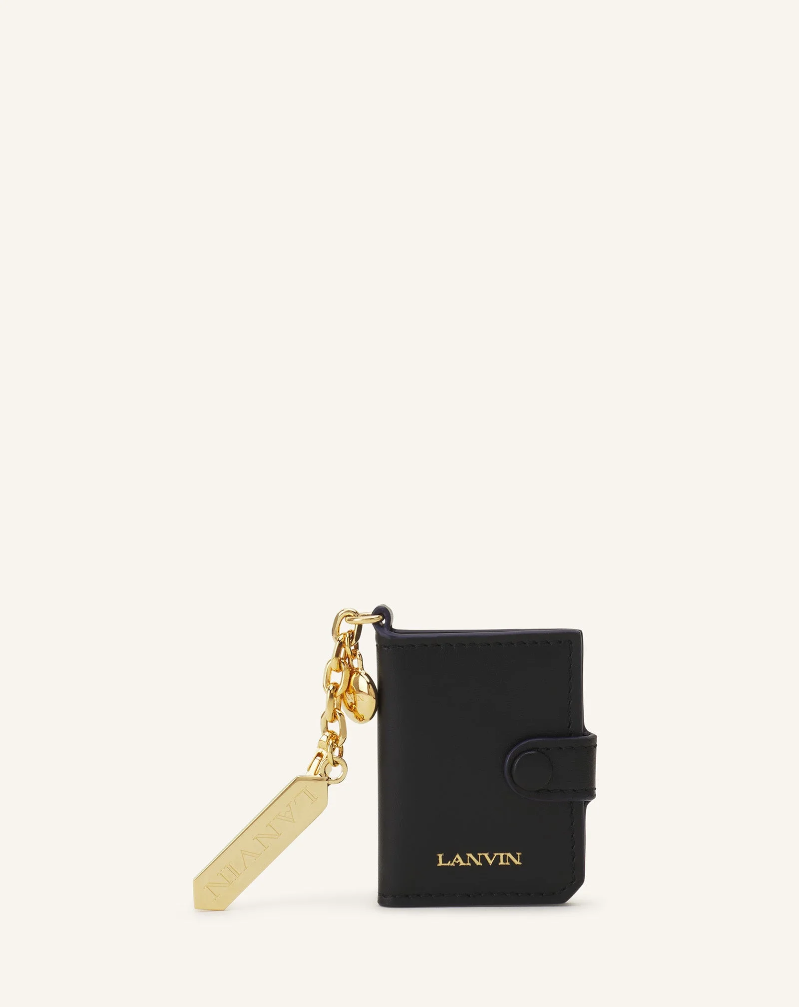 This leather photo holder is an intimate, personalized accessory. It is embellished with a gold chain adorned with a jewel and a Lanvin metal label. Simple and elegant, it goes with you wherever you go. Details - Lanvin leather photo holder - Two charms attached to the side - Lanvin blue lining - Lanvin logo embossed in front - Made in Italy Composition - Main fabric : 100% calf - bos taurus - Lining : 100% calf - bos taurus SKU: LW-SLTYPH-SMLE-H2510U