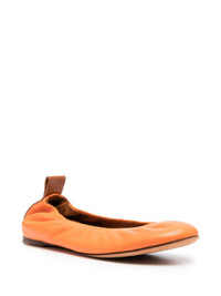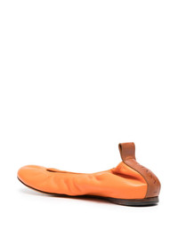 leather ballerina shoes Lanvin's ballerina shoes are imbued with Parisian minimalism. Crafted from soft leather, a contrasting debossed logo tab at the heel completes the slip-on design. Highlights - Orange/brown - Calf leather - Ruched detailing - Round toe - Slip-on style - Logo pull-tab at the heel - Branded insole - Leather sole Made in Italy Composition Sole: Calf Leather 100% Outer: Calf Leather 100% Lining: Calf Leather 100% SIZE & FIT FittingInformation This piece fits small – take one size up Measurement HEEL 0.39 in(1 cm)