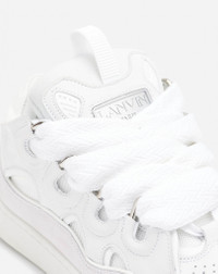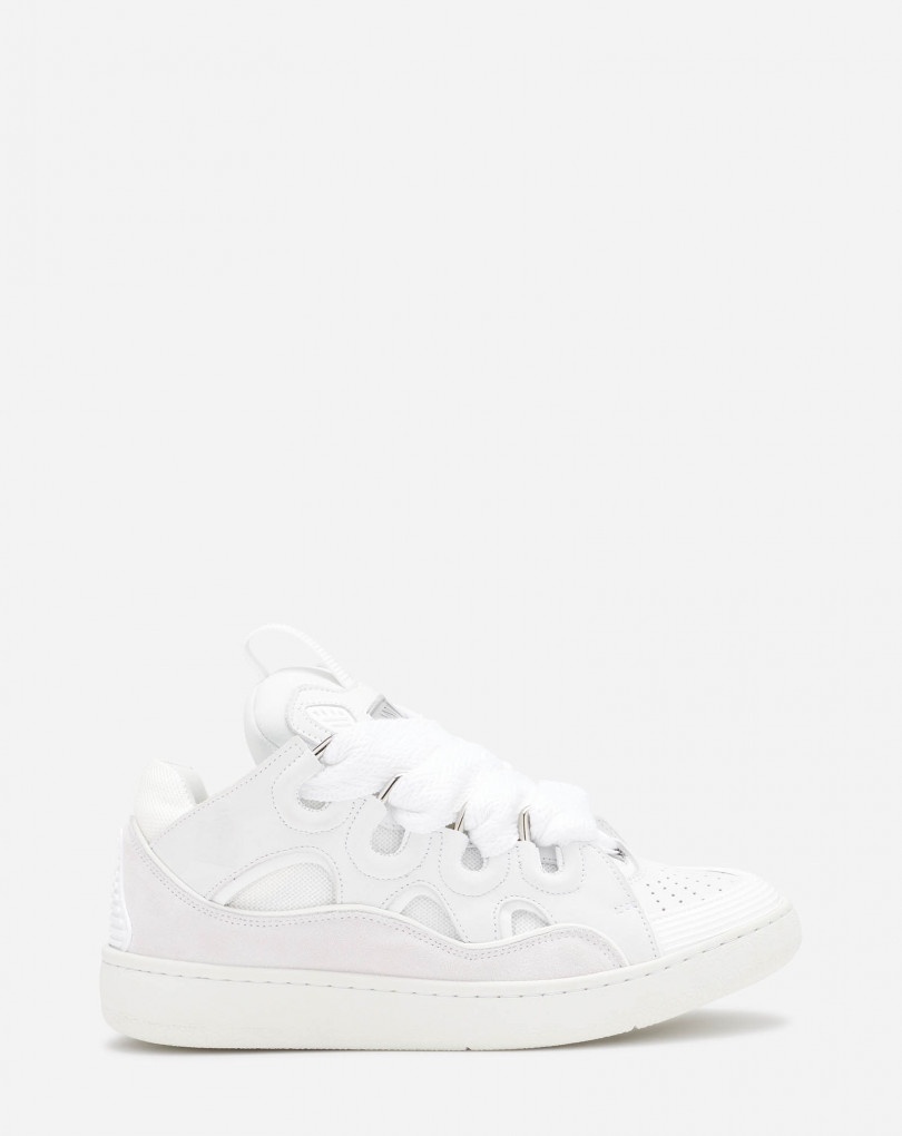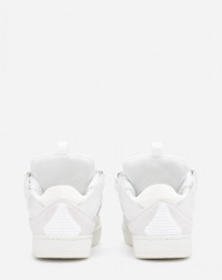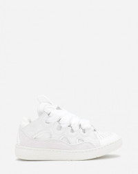 The Curb is a sneaker inspired by the 90s, with a confident design and exaggerated dimensions. Made in nappa calfskin, suede and mesh, this elaborately constructed shoe stands out for its extraordinary comfort thanks to the rounded shape, padded tongue, and curved metallic eyelets. Details - Leather Curb sneakers - Color: White - Quilted tongue with Lanvin label and embossed Mother and Child logo - Double waxed and woven herringbone laces - Made in Portugal Composition - Main material: 100% calfskin - Material 2: 100% calfskin - Material 3: 100% polyester weave - Lining: 82% polyester weave and 18% Elastane - Sole: Rubber Cleaning and care - Clean gently with a soft cloth or bristled brush without products. - Store in a dry, dark place in its original packaging. FW-SKDK02-DRAG-H220000