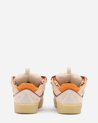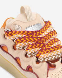 The Curb is a sneaker inspired by the 90s, with a confident design and exaggerated dimensions. Made in nappa calfskin, suede and mesh, this elaborately constructed shoe stands out for its extraordinary comfort thanks to the rounded shape, padded tongue, and metallic eyelets. Details - Leather Curb sneakers - Color: Pale Pink, Mango - Made in Portugal Size and fit - Quilted tongue with Lanvin label and embossed Mother and Child logo - Double waxed and woven herringbone laces Composition - Main material: 100% calfskin - Material 2: 100% calfskin - Material 3: 100% polyester weave - Lining: 82% polyester weave and 18% Elastane - Sole: Rubber Cleaning and care - Clean gently with a soft cloth or bristled brush without products. - Store in a dry, dark place in their original packaging. SKU: FW-SKDK02-DRAG-E23B51835