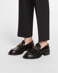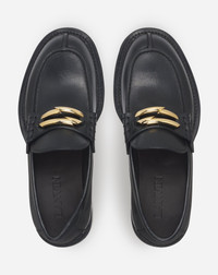 The Medley line offers modern leather loafers, perfect for a stylish everyday look. Details - Smooth leather Medley loafers - Color: Black - Made in Italy Size and fit - Loafers featuring a tongue with Sequence by Lanvin embellishment - Goodyear welt - Metallic detail on the sole at the forefoot - Leather, rubber and metal monobloc sole Composition - Main material: calfskin - Lining: calfskin - Sole: Rubber and calfskin Cleaning and care - Gently rub the leather with a damp cloth and a dab of suitable moisturizer. Wipe gently with a soft, dry cloth. - Place a shoe tree inside to keep the shape. - Store in a dry, dark place in their original packaging. SKU: FW-SHGL02-CARB-A231037