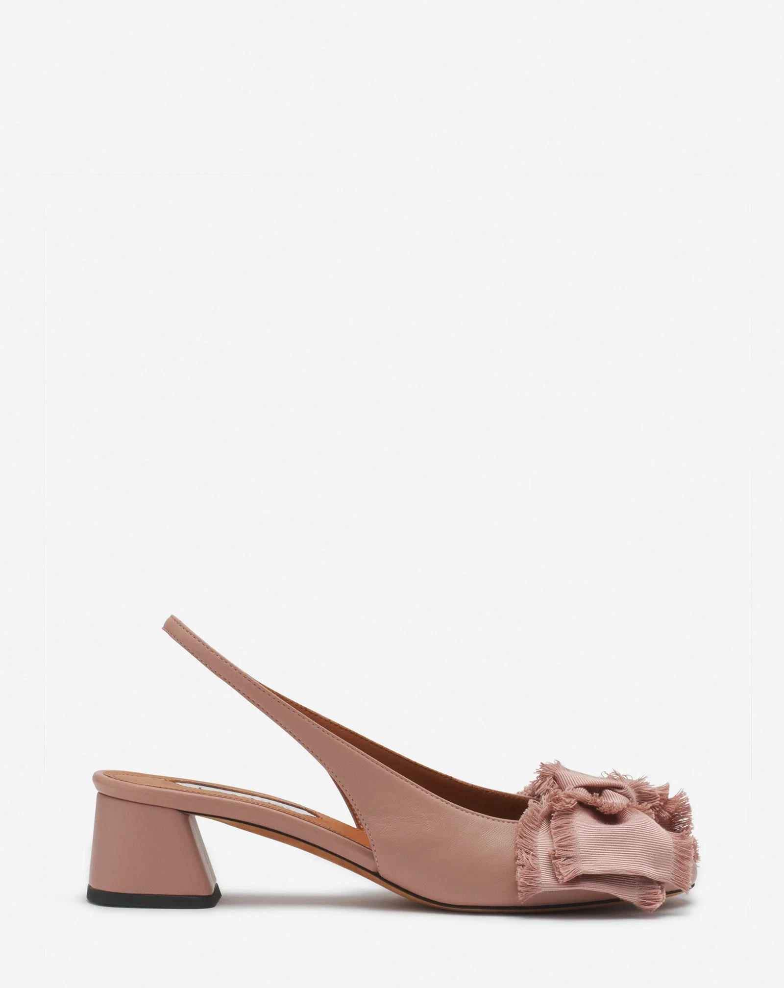 This collection introduces a reinterpretation of the ballerina, an iconic model of the House, with a heeled slingback version. With an oversized bow, these shoes are elegant and feminine, the perfect addition to your smart casual outfits. Details - Leather-heeled slingback ballerina - Round toe - Boot heel - Elastic strap at the back of the shoe - Grosgrain bow in front - Leather insole, featuring a stitched Lanvin logo - Heel Height: 3.5 cm / 1.4 in - Made in Italy Size & fit - This style fits true to size, you may take your usual size. - The size displayed corresponds to a French size Composition - Outer main material : ,100% calf - bos taurus - Lining : 100% lambskin - ovis aries SKU: FW-BAMB07-NAPA-E255139