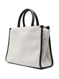 logo-embossed tote bag Highlights - Ecru/black - Cotton-linen blend - Leather trim - Embossed logo to the front - Two top handles - Adjustable detachable shoulder strap - Open top - Main compartment - Removable pouch Made in Italy Composition Outer: Calf Leather 100%, Cotton 60%, zamac 50%, Brass 50%, Linen/Flax 40% Lining: Cotton 60%, Linen/Flax 40% SIZE & FIT Model measurements Height 5 ft 9 in(1.76 m) Bust/Chest 31.88 in(81 cm) Hips 35.43 in(90 cm) Waist 24.8 in(63 cm) Measurement DEPTH 4.33 in(11 cm) HANDLE 5.51 in(14 cm) HEIGHT 7.87 in(20 cm) STRAP 47.24 in(120 cm) WIDTH 12.99 in(33 cm)
