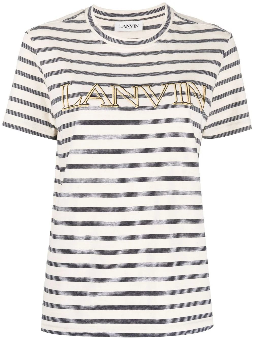 logo-print striped T-shirt Adorned with a horizontal stripe print, this T-shirt from Lanvin features a stencil-style logo at the chest. The branding pops against the striped background for an unmistakable look. Highlights - Ecru - Yellow - Cotton - Logo print at the chest - Horizontal stripe print - Crew neck - Short sleeves - Straight hem Made in Italy Composition Cotton 100% SIZE & FIT Model measurements Height 5 ft 11 in(1.8 m) Bust/Chest 33.07 in(84 cm) Hips 37.4 in(95 cm) Waist 25.19 in(64 cm) FittingInformation Designed for a relaxed fit, this piece allows for comfort and movement when worn Made from a midweight non-stretch fabric, this piece offers minimal elasticity when worn This piece fits true to size – take your usual size Washing instructions Machine Wash