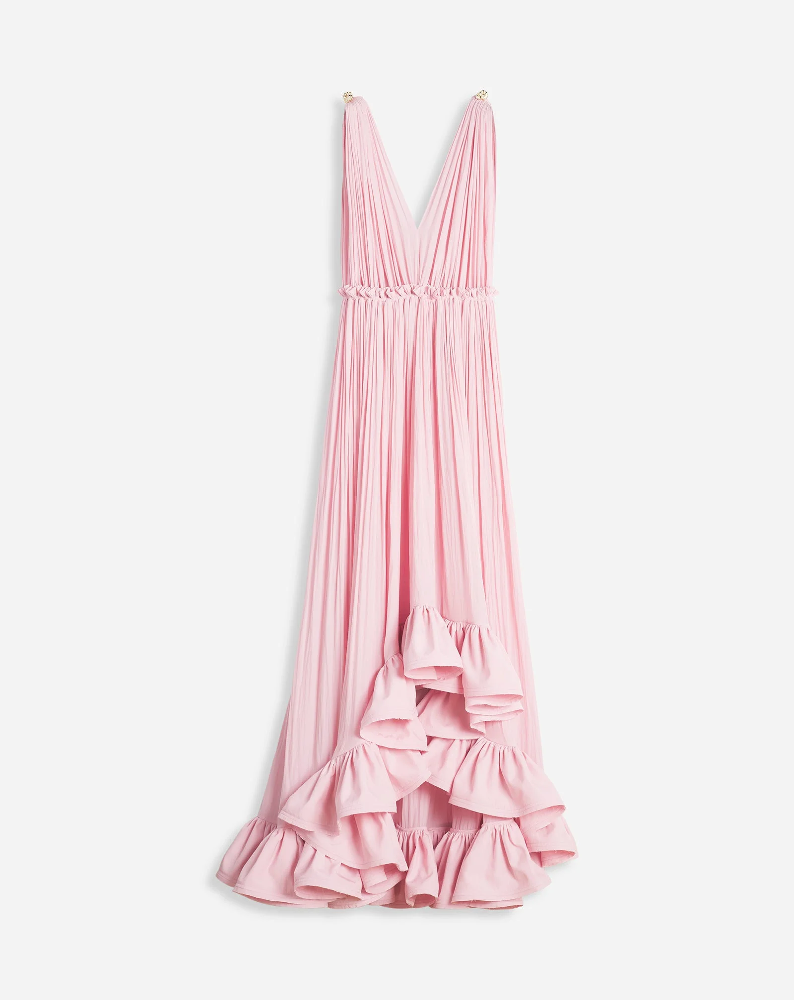 The lines of this dress create a sophisticated look, a perfect choice for evening wear. The drape and plunging neckline are completed by a row of ruffles at the bottom of the dress, which add movement and volume, in contrast with the marked waist. Details - Long ruffled dress with a cascade effect - V-neck - Slip-on - Made in Spain Size & fit - This is a relaxed fit, size down if you are between two sizes - For more information, please see our size guide. Composition - Main fabric : 100% polyester woven SKU: RW-DRC035-4778-A245238