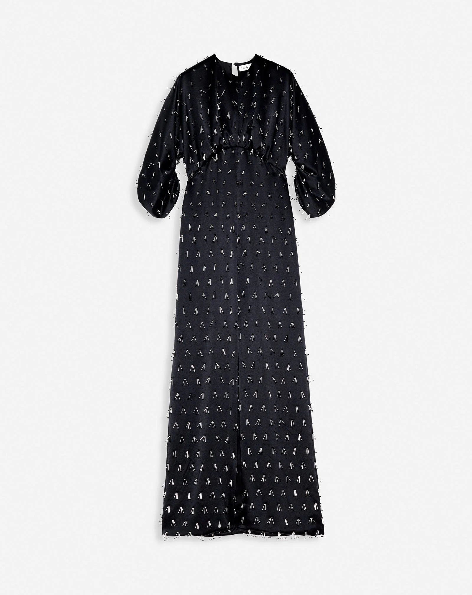 Embroidered details pay tribute to Marguerite, Jeanne Lanvin's daughter. 95 hours of handmade embroidery went into creating this exquisite motif, which depicts small bouquets of flowers. Details - Long fully embroidered dress - Feminine shape: gathering on the waist and sleeves - 3/4-length sleeves - Front and back slits - Openwork back - Color: black - Made in Spain Size and fit - The model is 177 cm / 5'9'' tall - She wears a size 36 Composition - Main material: 70% cellulose acetate, 30% viscose - Lining: 100% viscose - Embroidery: 5% polyester, 95% glass Cleaning and care - Requires very delicate care - Do not iron the embroidery - Have cleaned by a luxury dry cleaning specialist only SKU: RW-DR9212-3421-A231036