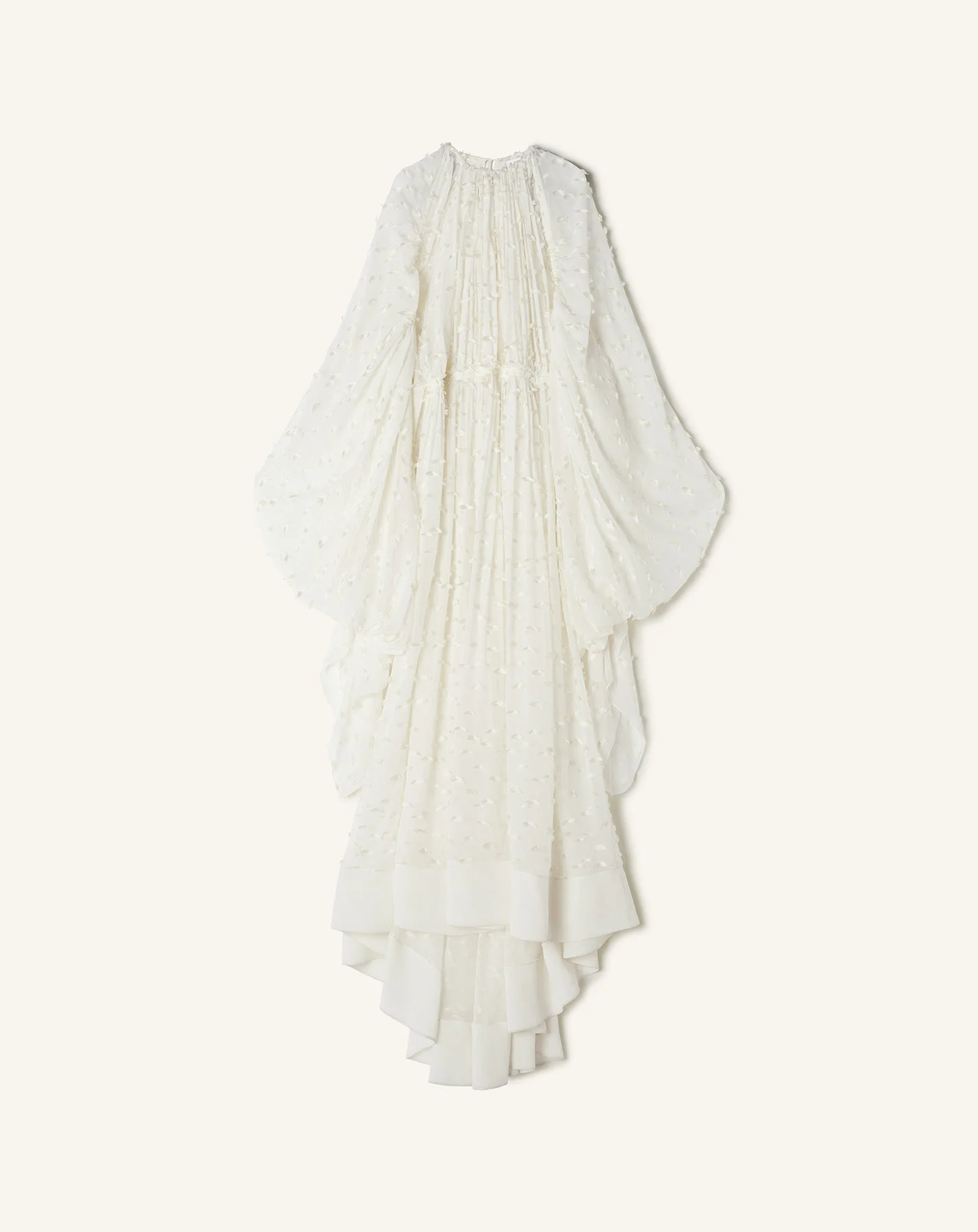 This dress is crafted from silk georgette plumetis fabric, which accentuates the lightness and softness of its design It creates an elegant, feminine silhouette, making it the ideal choice for evening wear. Details - Pleated long-sleeve dress in silk georgette - Flowing, long and loose design, with fitted waist - Round neckline with tie ribbon - Tapered cuffs - Slip-on - Made in France Size & fit - For more information, please see our size guide. Composition - Main fabric : 100% polyester woven - Lining : 100% silk woven SKU: RW-DR0028-6172-H2500031