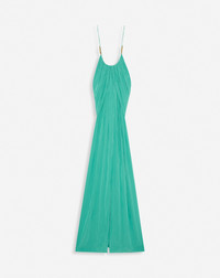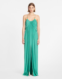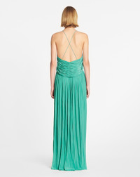 To achieve a flowing shape that falls naturally, the charmeuse dresses were draped by hand using artisanal techniques found in the Lanvin archives. Details - Long flowing plain charmeuse dress with crossed straps at the back - Slit on the front - Draped effect from the neckline to the back - Embellished with Sequence beads on each strap - Color: jade - Made in France Size and fit - The model is 189 cm / 6'2.5" tall - She wears a size 36 Composition - Main material: 100% polyester Cleaning and care - Requires very delicate care - Have cleaned by a luxury dry cleaning specialist only SKU: RW-DR0016-4778-A2346136