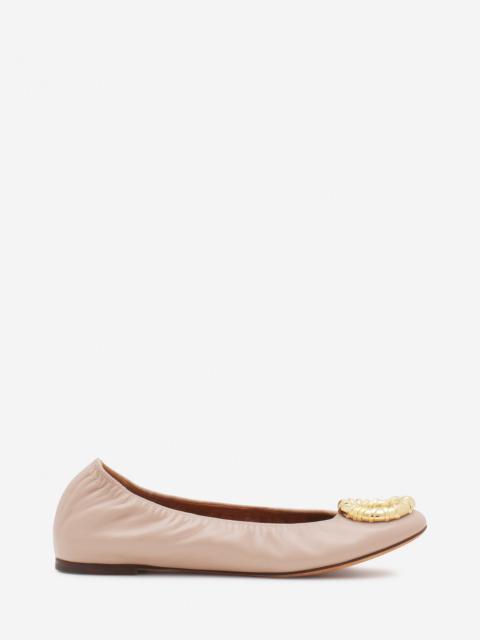 The collection welcomes the return of a House icon: the ballerina flat. This signature Lanvin shoe, which has been emblematic since the early 2000s, combines elegance, simplicity and comfort. It is a must-have and is perfect for a chic, casual outfit. This ballerina flat also features a Melodie jewel, a tribute to the dresses of the same name designed by Jeanne Lanvin. Details - Melodie jewel placed in front - Leather pull tab in back with an embossed Lanvin logo - Leather insole with a stitched Lanvin label - Round toe - Made in Italy Size & fit - This style fits true to size, you may take your usual size. Composition - Lining : 80% calf,20% goatskin - Sole : 100% cow SKU: FW-BAMB03-NAPA-P240935