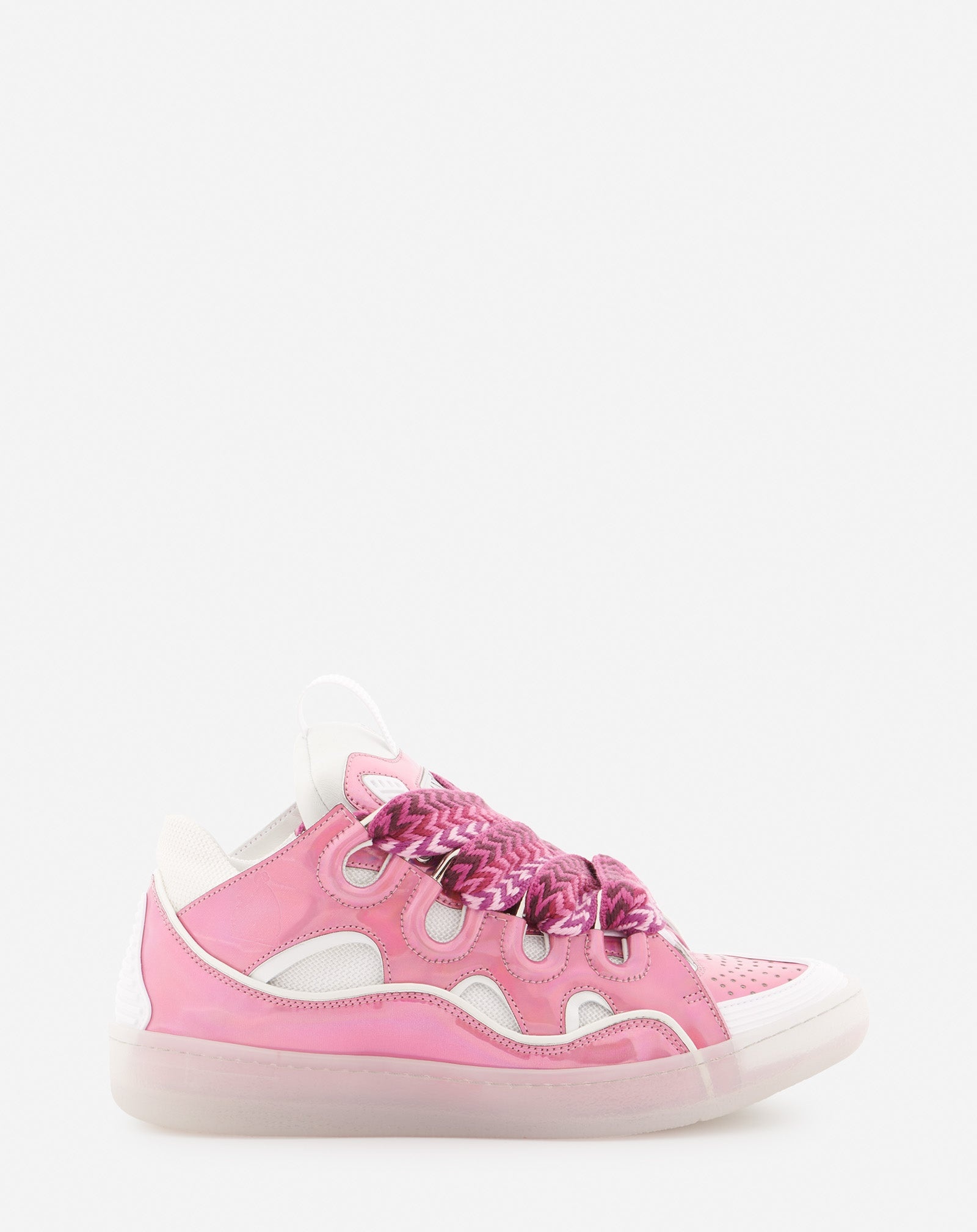 The Curb is a sneaker inspired by the 90s, with a confident design and exaggerated dimensions. Made in nappa calfskin, suede and mesh, this elaborately constructed shoe stands out for its extraordinary comfort thanks to the rounded shape, padded tongue, and curved metallic eyelets. Details - Metallic leather Curb sneakers - Color: Pink, White - Quilted tongue with Lanvin label and embossed Mother and Child logo - Double waxed and woven herringbone laces - Metallic-effect leather - Made in Portugal Composition - Main material: 100% calfskin - Material 2: 100% calfskin - Material 3: 100% polyester weave - Lining: 82% polyester weave and 18% Elastane - Sole: Rubber Cleaning and care - Clean gently with a soft cloth or bristled brush without products. - Store in a dry, dark place in its original packaging. SKU: FW-SKDK02-IRID-P23500035