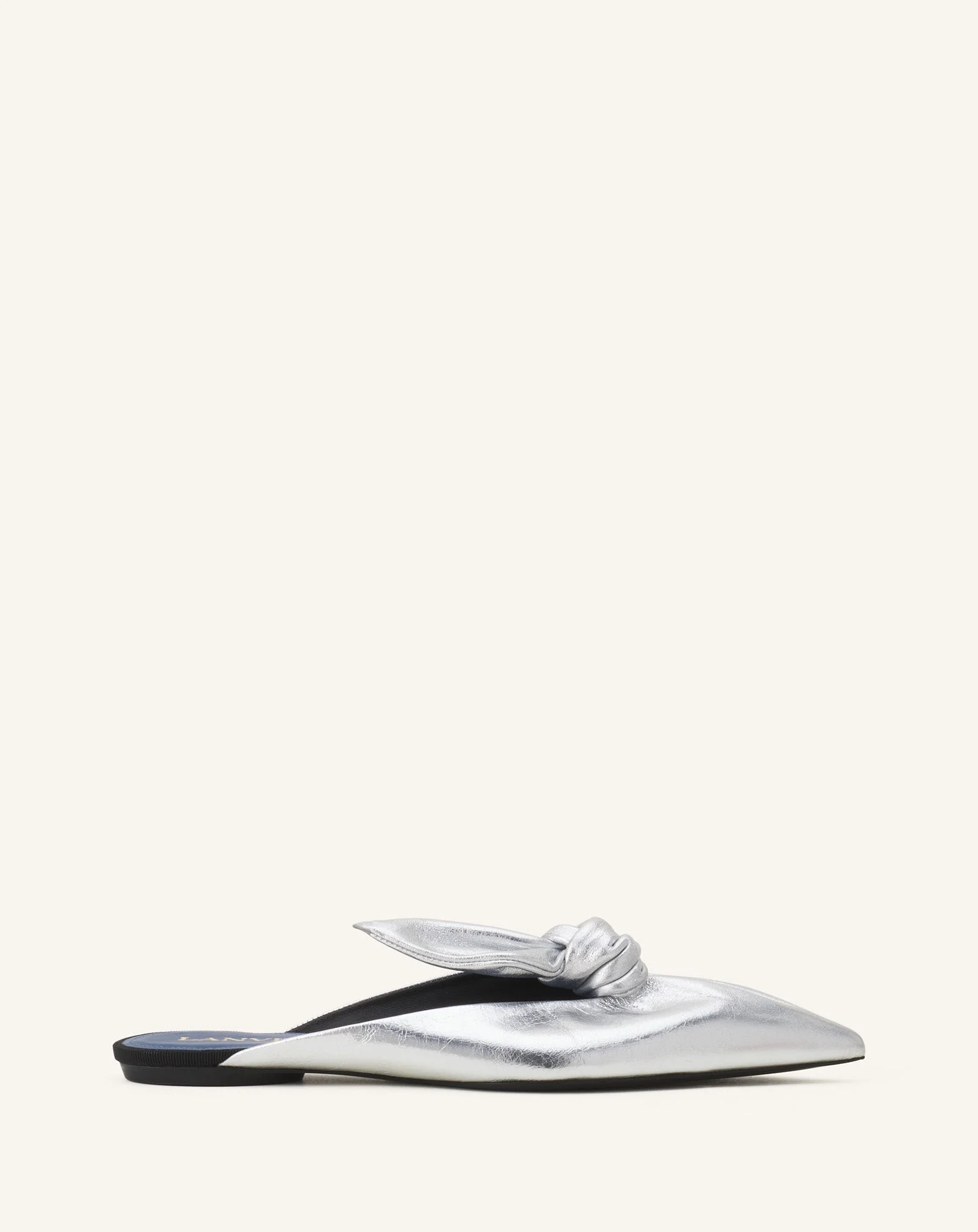 The Midnight Step bow mule in metallic leather embodies simplicity and refinement. The sleek, contemporary design echoes the lines of a subtly daring neckline, complete with a curved heel that is both stable and lightweight. The insole is hot-stamped with the House's signature in gold. This precious and elegant creation makes every step a gesture filled with character. Details - Midnight Step Mules with a metallic leather bow - Leather bow on the front - Lanvin logo hot-stamped in gold - Lanvin blue padded insole - Made in Italy Size & fit - This style fits true to size, you may take your usual size. - The size displayed corresponds to a French size SKU: FW-SHGA0A-META-H25M236