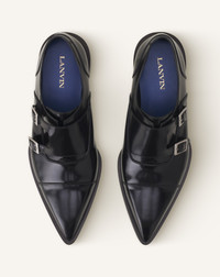 Iconic and sophisticated, Lanvin's leather Monk shoes reinvent a classic men's wardrobe model with a modern twist. Their elegant design, enhanced by two distinctive buckles, fuses tradition and boldness, in the spirit of the Winter 2025 collection. These shoes embody the perfect balance between timeless refinement and contemporary innovation. Details - Monk shoes in glossy leather - Metal buckles on side - Leather yoke with topstitching - One-piece leather sole with an offset heel - Blue insole with an embossed Lanvin logo - 2.5 cm heel - Made in Italy Size & fit - This style fits true to size, you may take your usual size. - The size displayed corresponds to a French size SKU: FM-SHGA05-SPAZ-H251041