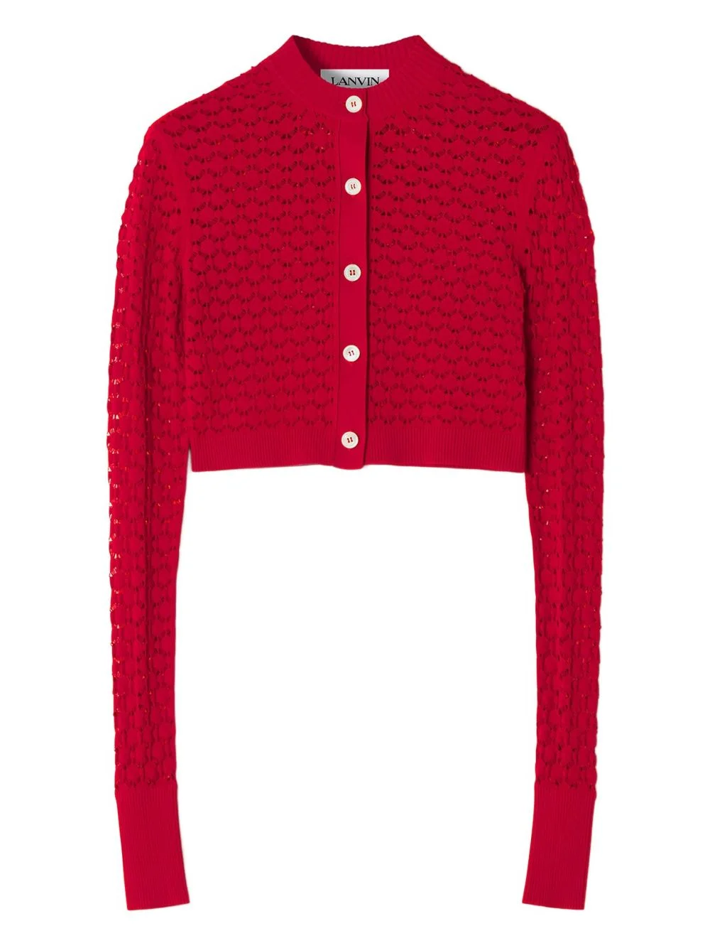 openwork cardigan Highlights - Red - Openwork knit - Button fastening - Long sleeves - Round neck - Ribbed hem Imported Composition Viscose 67%, Polyester 33% Washing instructions Read Manufacturer Guidelines