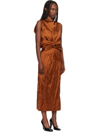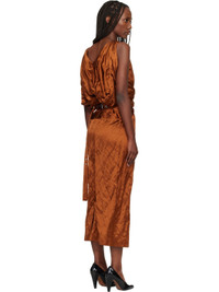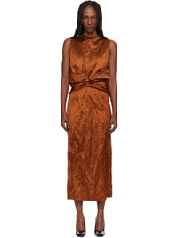 Crinkled viscose- and cotton-blend satin maxi dress. · Metallic thread detailing throughout · Boat neck · Draping and twisted detailing at waist · Integrated pin buckle belt at waist · Central vent at back hem · Partial satin lining Supplier color: Chestnuts Body: 53% viscose, 36% cotton, 11% metal. Trim: 100% cupro. Made in Italy 252254F055001