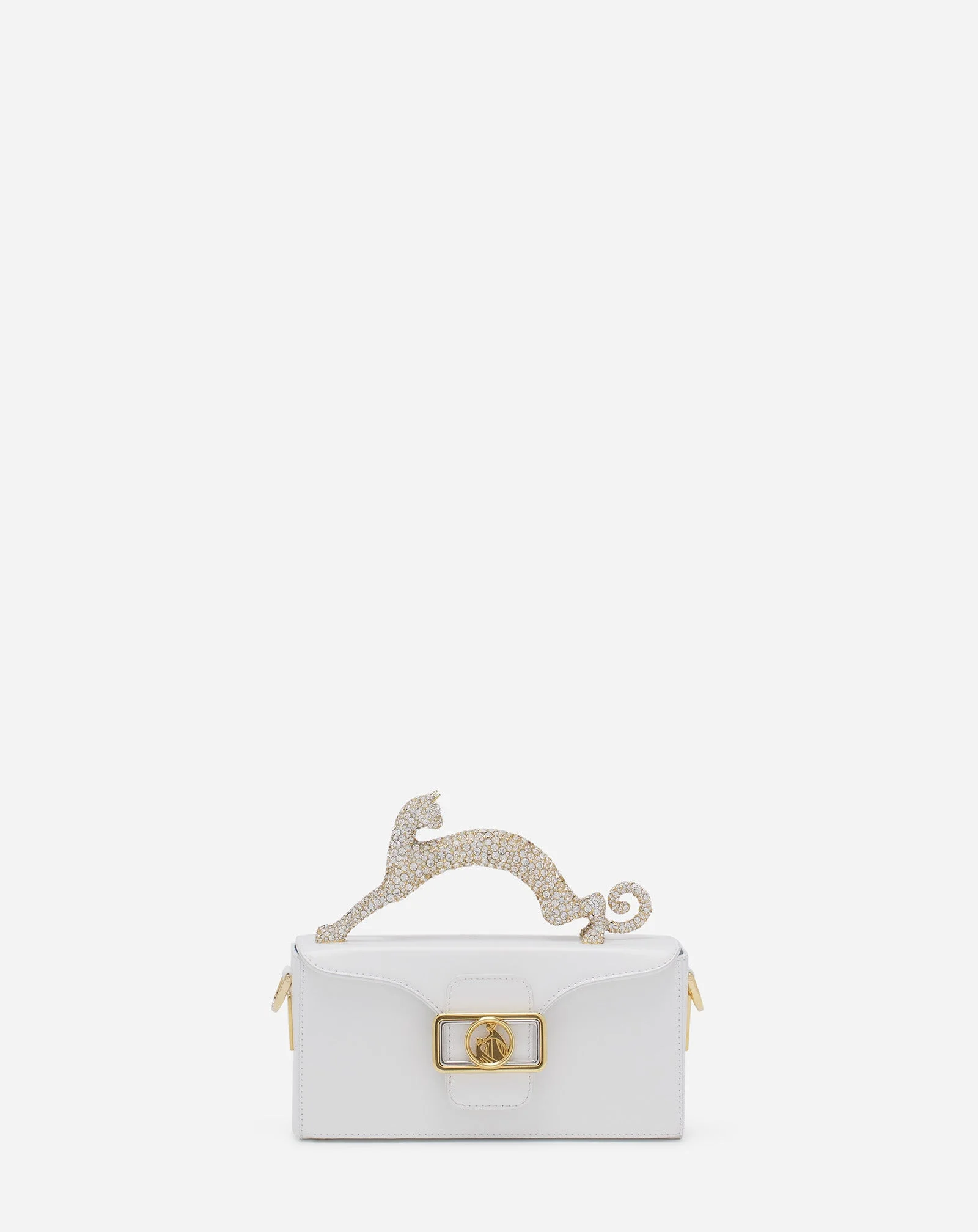 A unique collector's bag from the House of Lanvin, the Pencil Cat is trimmed with a sculptural jeweled handle, inspired by an andiron that belonged to Jeanne Lanvin and was designed by the French interior designer Armand-Albert Rateau. This collection features the iconic cat handle with 1,579 hand-applied rhinestones. Details - Pencil Cat Nano bag in leather and rhinestones - Removable chain shoulder strap - Cat-shaped jewel handle decorated with 1,579 rhinestones - Interior patch pocket - Leather lining - Mother and Daughter magnetic jewel clasp - Four metal feet - Metal jewelry with a gold finish - Made in Italy Composition - Lining : 100% calf - bos taurus SKU: LW-BGBRS3-TOPC-E2500U
