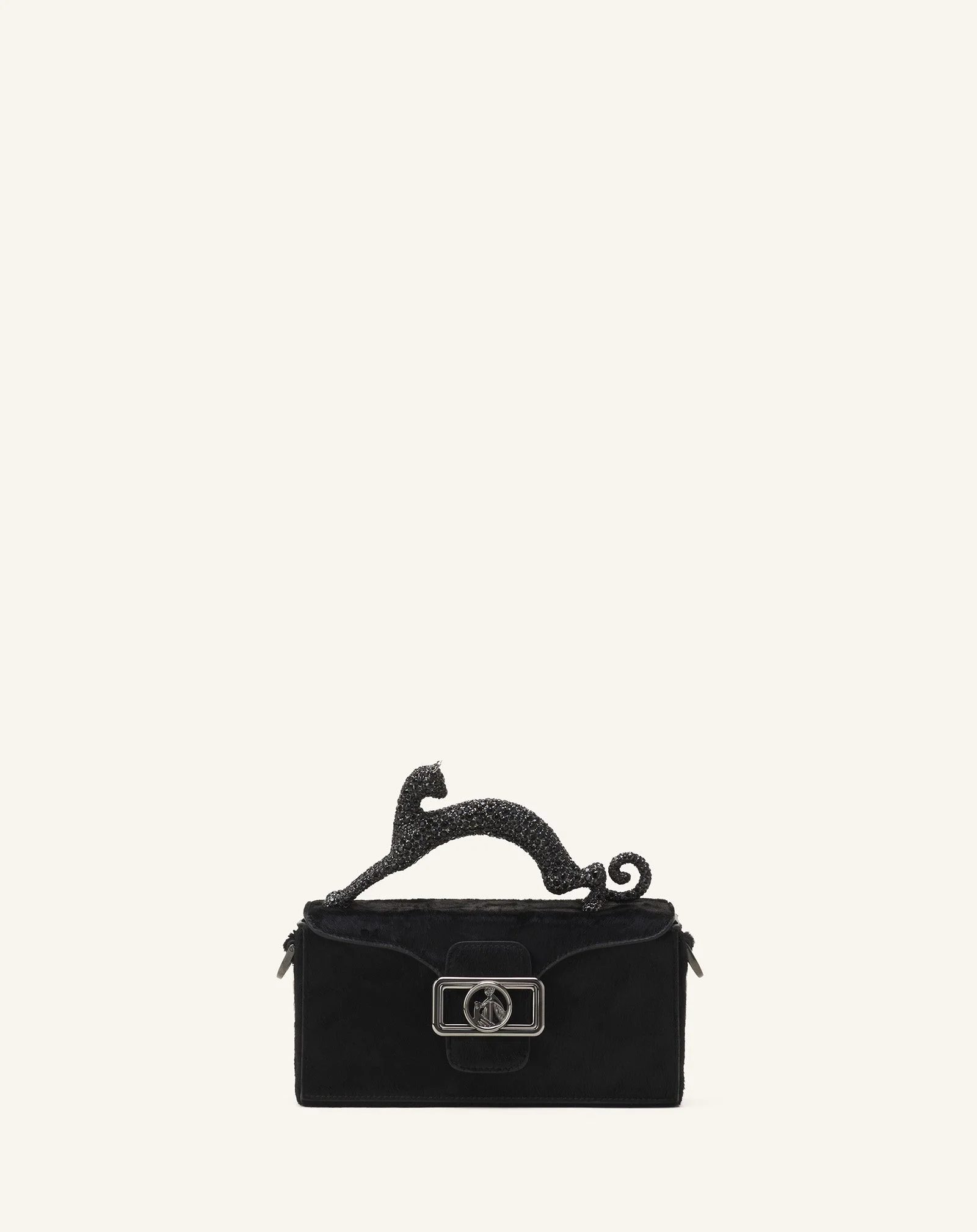 A unique collector's bag from the House of Lanvin, the Pencil Cat features a sculptural cat-shaped handle. This jewel-like handle was inspired by an andiron that belonged to Jeanne Lanvin and was designed by her friend, the French interior designer Armand-Albert Rateau. For this version of the Pencil Cat Nano bag, the iconic cat handle is adorned with 1,579 hand-applied rhinestones. Details - Pencil Cat Nano bag in pony-effect leather with rhinestones - Cat-shaped jewel handle decorated with 1,579 rhinestones - Mother and Daughter palladium jewel clasp - Ruthenium-finished metal chain, removable thanks to two hooks - Decorative metal elements on the side - Made in Italy Composition - Main fabric : 100% calf fur - bos taurus - Lining : 100% lamb ovis aries SKU: LW-BGBRS3-POCA-H2510U
