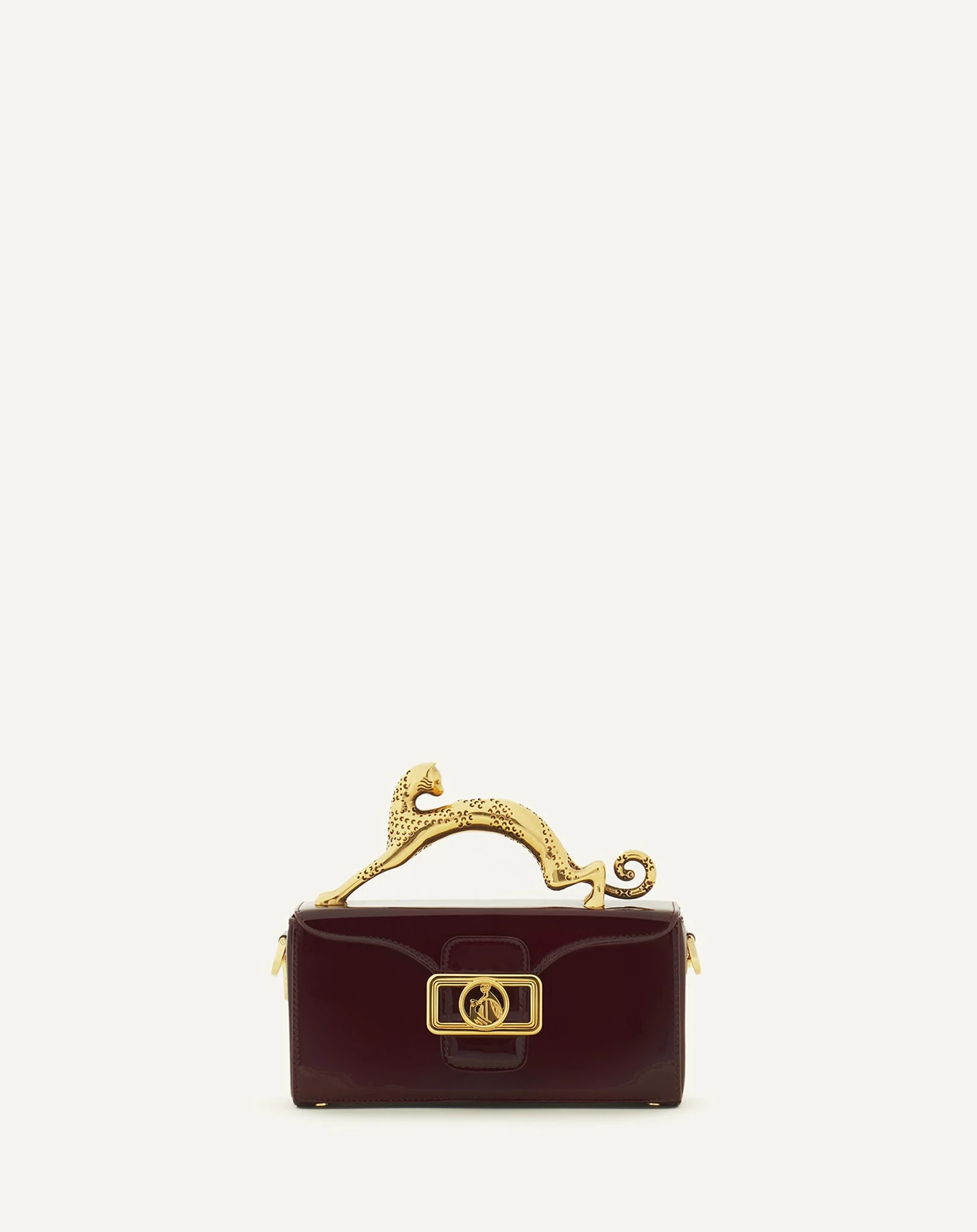 A unique collector's bag from the House of Lanvin, the Pencil Cat features a sculptural cat-shaped handle. This jewel-like handle was inspired by an andiron that belonged to Jeanne Lanvin and was designed by her friend, the French interior designer Armand-Albert Rateau. Details - Pencil Cat Nano patent leather bag - Cat-shaped jewel handle - Gold-finish Mother and Daughter clasp - Removable metal chain thanks to two metal hooks - Decorative metal elements on the side - Made in Italy Composition - Lining : 100% lamb ovis aries SKU: LW-BGBR03-GLCA-H25355U