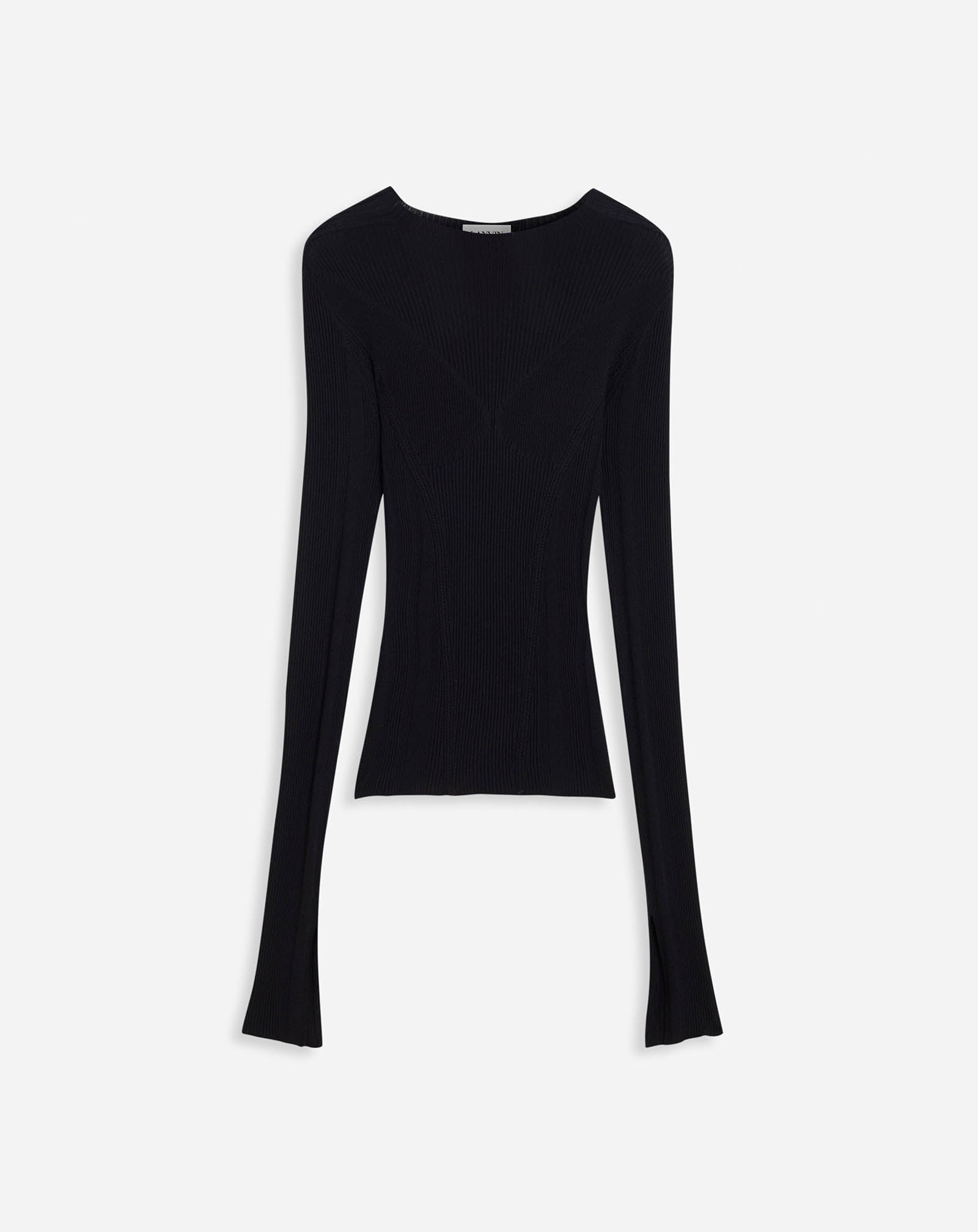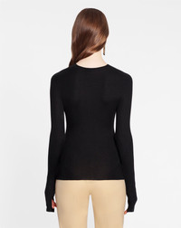Details - Round neck long sleeve ribbed top in silk and cashmere - Color: black - Round neck long sleeve fiited jumper in fine rib. - The knit pattern enhances the feminine shape. - Made in italy Composition - Main material: 30% silk, 35% virgin wool, 35% cashmere SKU: RW-PO0020-K004-P2310L