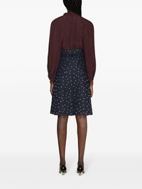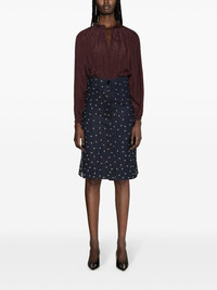 ruffle-detailed flared blouse This brown Lanvin top takes its cues from the medieval fashion from the 1978 film ‘Perceval le Gallois’ – most notably the ruffled and gathered tie neck. The soft ripples add depth and texture to the polka-dot jacquard pattern. Highlights - Chocolate brown - Satin finish - Patterned jacquard - Ruffle collar - Gathered tie neck - V-neck - Long raglan sleeves - Buttoned cuffs - Flared hem Made in Italy Composition Polyester 100% SIZE & FIT Model measurements Height 5 ft 11 in(1.8 m) Bust/Chest 34.25 in(87 cm) Hips 35.82 in(91 cm) Waist 24.8 in(63 cm) FittingInformation Designed to be unstructured, offering a loose fit throughout The adjustable drawstring means that you can adjust this piece’s fit to suit your comfort and preference Made from a lightweight non-stretch fabric This piece fits true to size – take your usual size Washing instructions Dry Clean Only