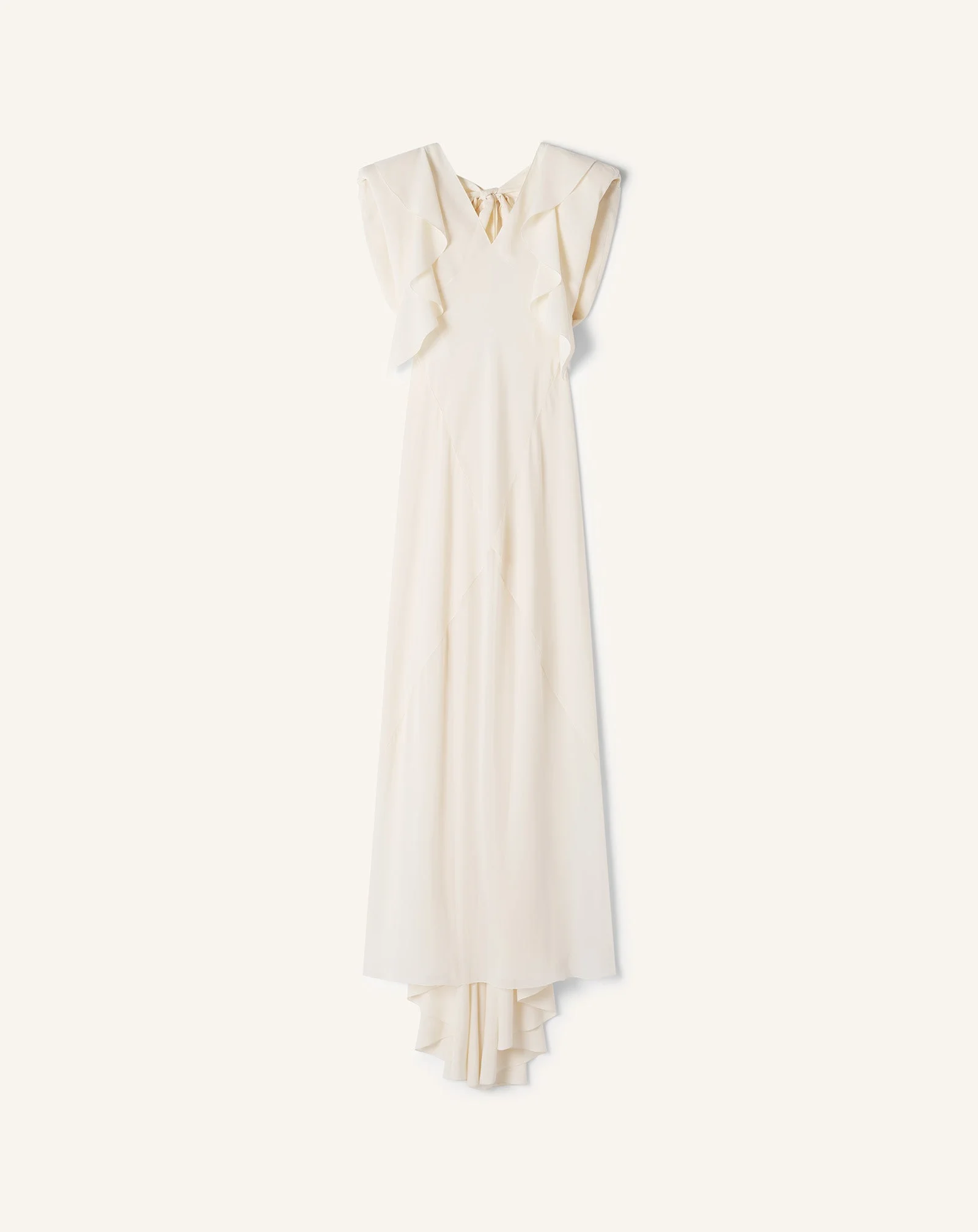 This evening gown, crafted from exquisite silk georgette, plays on two of the House's signatures: contrast and geometric shapes. The transparency effect on the skirt pays tribute to the contrasts that can be found in the archives. As for the geometric shapes, they refer to the silhouettes of the 1930s and the Lanvin Decoration designs created between 1920 and 1925. The fluidity of this dress creates an elegant movement, further enhanced by the frills at the armholes. The exaggerated shoulders and geometric cutouts structure the silhouette for an elegant look, while the draped back adds a sophisticated touch. Details - Long dress in silk georgette - V-neck - Built-in shoulder pads - Frilled armholes - Open back with tie-up ribbon - Zipped fastening - Made in Italy Size & fit - This style fits true to size, take your normal size - For more information, please see our size guide. Composition - Main fabric : 100% silk woven SKU: RW-DR0005-6244-P2602134