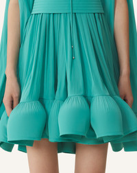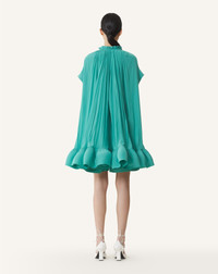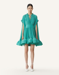 Details - Short dress in charmeuse - Short sleeve short dress in Charmeuse with bottom ruffles and fitted waist. - The dress features a topctitched belt and presents a generous volume for a glamorous and floaty look. - Made in slovakia Composition - Main material: 100% Japanese satin SKU: RW-DR209U-4778-H2046142