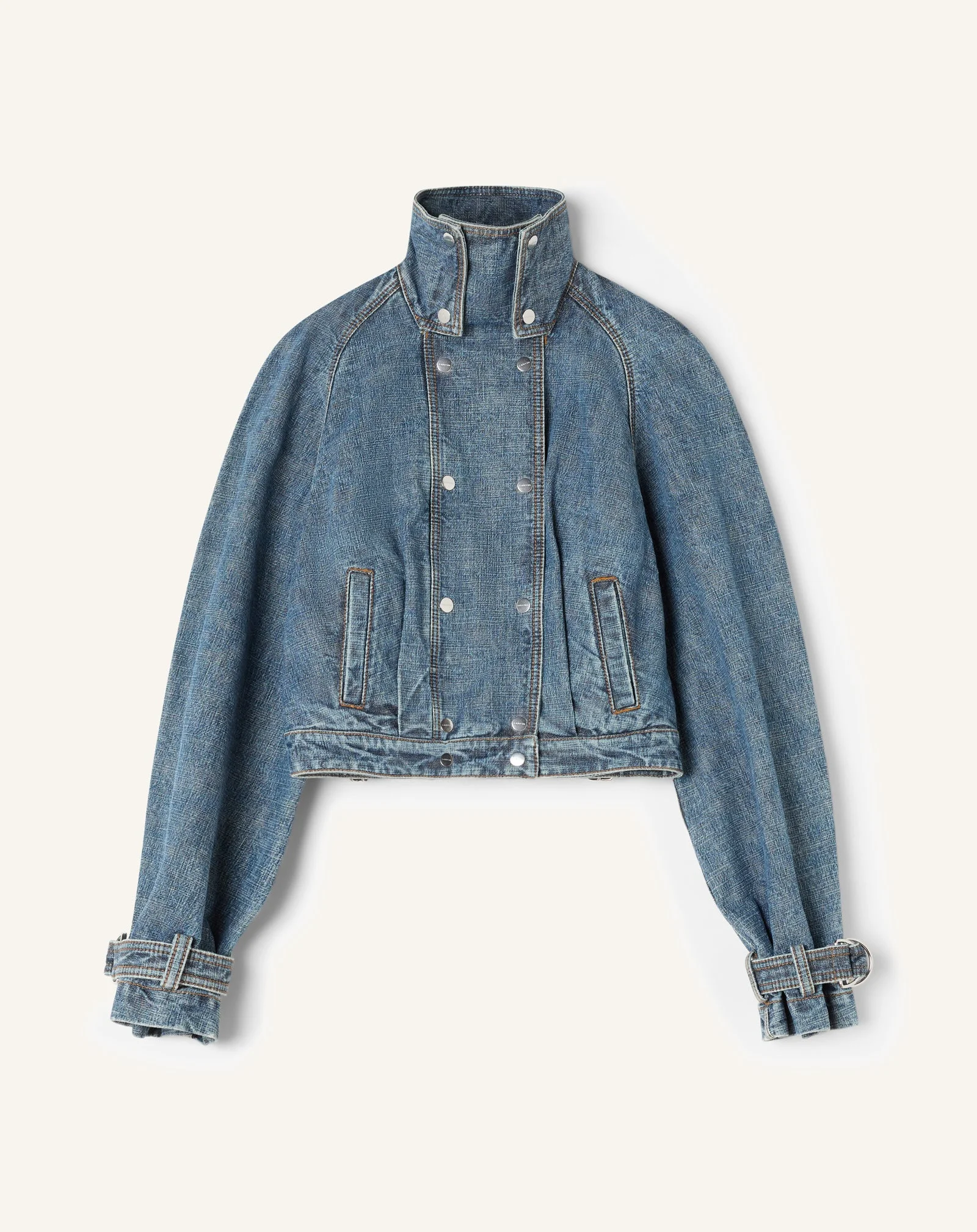This jacket is inspired by the style of the 1920s car coat, one of the first unisex garments in modern history. It pays tribute to Jeanne Lanvin, one of the first couturiers to have played with the codes of men's clothing for women. The high collar and double row of buttons create a contemporary silhouette, while the textured denim adds an elegant, casual touch, perfect for daytime wear, paired with the matching jeans. Details - Short, textured denim jacket - High collar - Round shoulders - Contrasting topstitching - Adjustable tabs on the cuffs and base - Double-breasted snap fastening - Made in Italy Size & fit - This style fits true to size, take your normal size - For more information, please see our size guide. Composition - Main fabric : 100% cotton woven SKU: RW-JA0329-D096-P262034