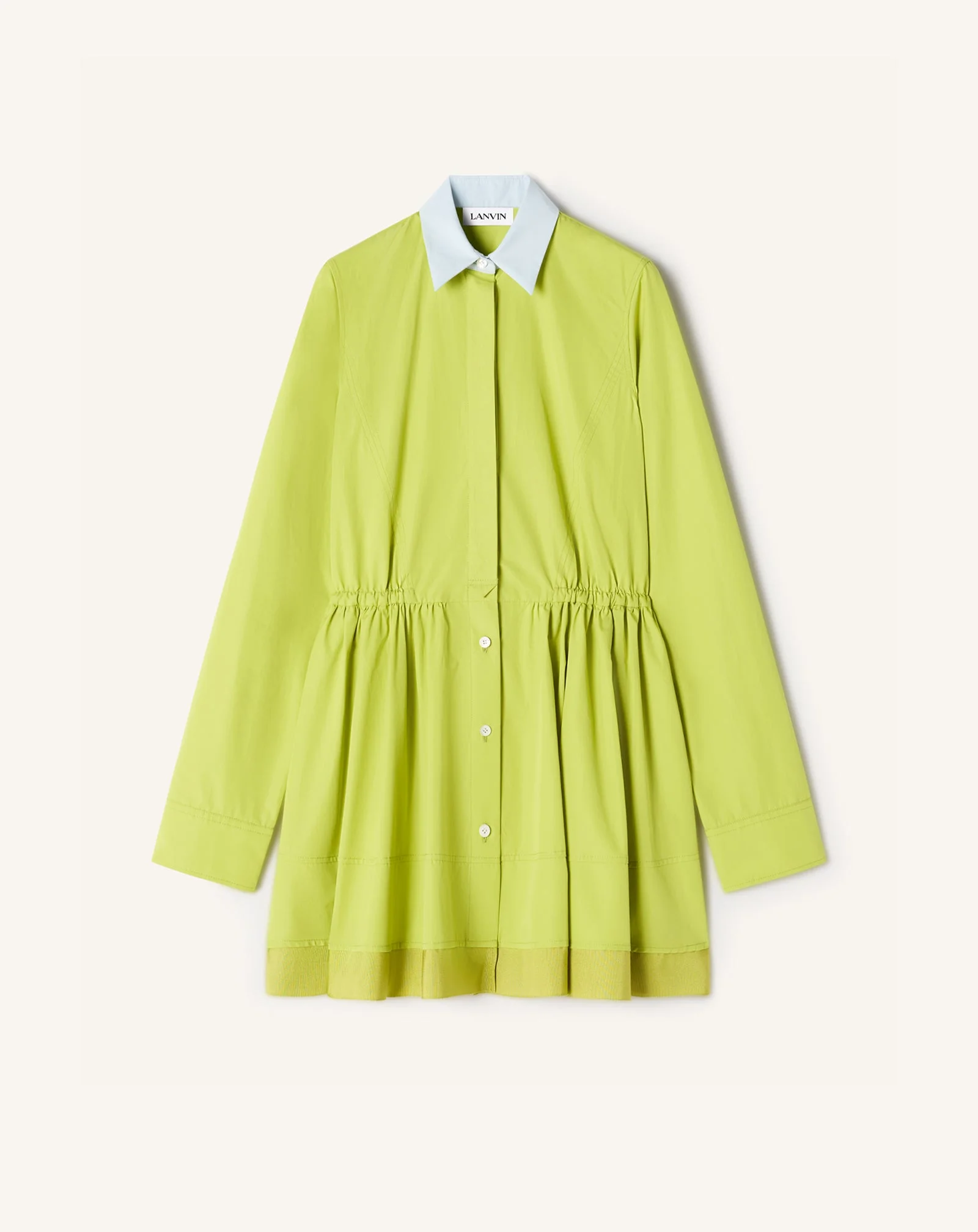 This short shirt dress is made from cotton with a very pleasant feel that perfectly enhances the cut, ideal for mid-season daytime wear. The asymmetrical cuffs represent Jeanne Lanvin's initials, with a rounded side for the J and a square side for the L. The embroidered ribbon on the back echoes one of the House's signatures and pays tribute to the grosgrain ribbons used by Jeanne Lanvin to finish the interior of her Haute Couture dresses and embellish her embroidery. The topstitched details are also inspired by the archives, recalling an embroidery technique used to structure the silhouette. Details - Short shirt dress in lightweight cotton poplin - Contrasting shirt collar - Grosgrain ribbon at the hem and back, embroidered with the Lanvin logo - Horizontal topstitching - Elasticated waist - Tapered cuffs with a single button fastening - Made in Italy Size & fit - This style fits true to size, take your normal size - For more information, please see our size guide. Composition - Main fabric : 100% cotton woven SKU: RW-DR0039-6166-P2643236