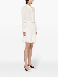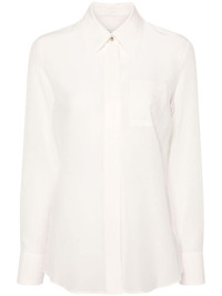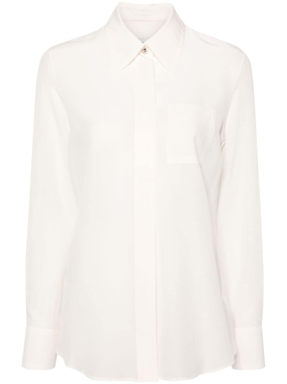 silk crepe de chine shirt Lanvin’s white shirt is as classic as it gets, save for the lone sculpted silver-tone button nestled between the point collar. It’s cut from silk crepe de chine to enhance the relaxed silhouette. Highlights - Off-white - Silk - Crepe de chine - Semi-sheer construction - Pointed flat collar - Long sleeves - Buttoned cuffs - Chest patch pocket - Curved hem - Embossed silver-tone buttons - Concealed front button fastening Made in France Composition Silk 100% SIZE & FIT Model measurements Height 5 ft 10 in(1.78 m) Bust/Chest 29.92 in(76 cm) Hips 34.64 in(88 cm) Waist 23.62 in(60 cm) FittingInformation Designed for a relaxed fit, this piece allows for comfort and movement when worn Made from a lightweight non-stretch fabric This piece fits true to size – take your usual size Washing instructions Dry Clean Only
