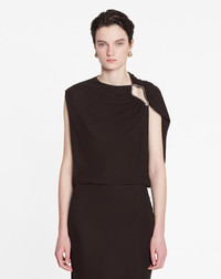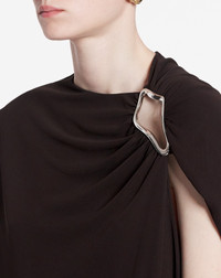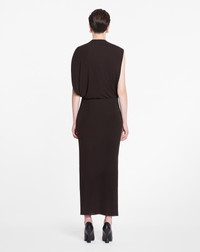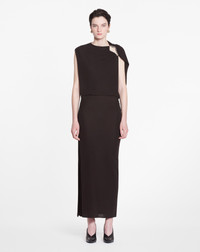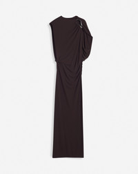 The eyelet detailing is a signature element of the Lanvin brand. It is featured in certain pieces from this collection as a reflection of the iconic legacy of the House. Details - Sleeveless draped dress in crepe jersey. - Eyelet opening at the shoulder. - Long dress with fitted and gathered waist. - Draped neckline - Camisole lining - Color: espresso - Made in France Size and fit - This style fits true to size, take your usual size. - For more information, please see our size guide. Composition - Main fabric: 100% viscose Cleaning and care - All our items are shipped in a luxurious Lanvin gift box done in the colors of the brand. - At Lanvin, we take great care to ensure we only select the finest materials. Please check the care label on your ready-to-wear item before proceeding with any cleaning. - If you have a question or concern, please contact our customer service department or visit one of our stores, where our staff will be happy to assist you and provide you with more information about our services. SKU: RW-DR0024-5803-H2369336
