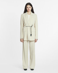 These pants create elegant lines with simplicity, for a chic, feminine outfit. The waistband features a tone-on-tone belt. Details - Tailored wool-blend pants - Straight fit - Metal zipper and hook - One welt pocket in the back - Bemberg lining - Made in Italy Size & fit - This style is fitted, size up if you prefer a more relaxed fit - For more information, please see our size guide. Composition - Main fabric : 54% viscose woven,46% wool woven - Lining : 100% bemberg tisse SKU: RW-TR0013-6028-P250440