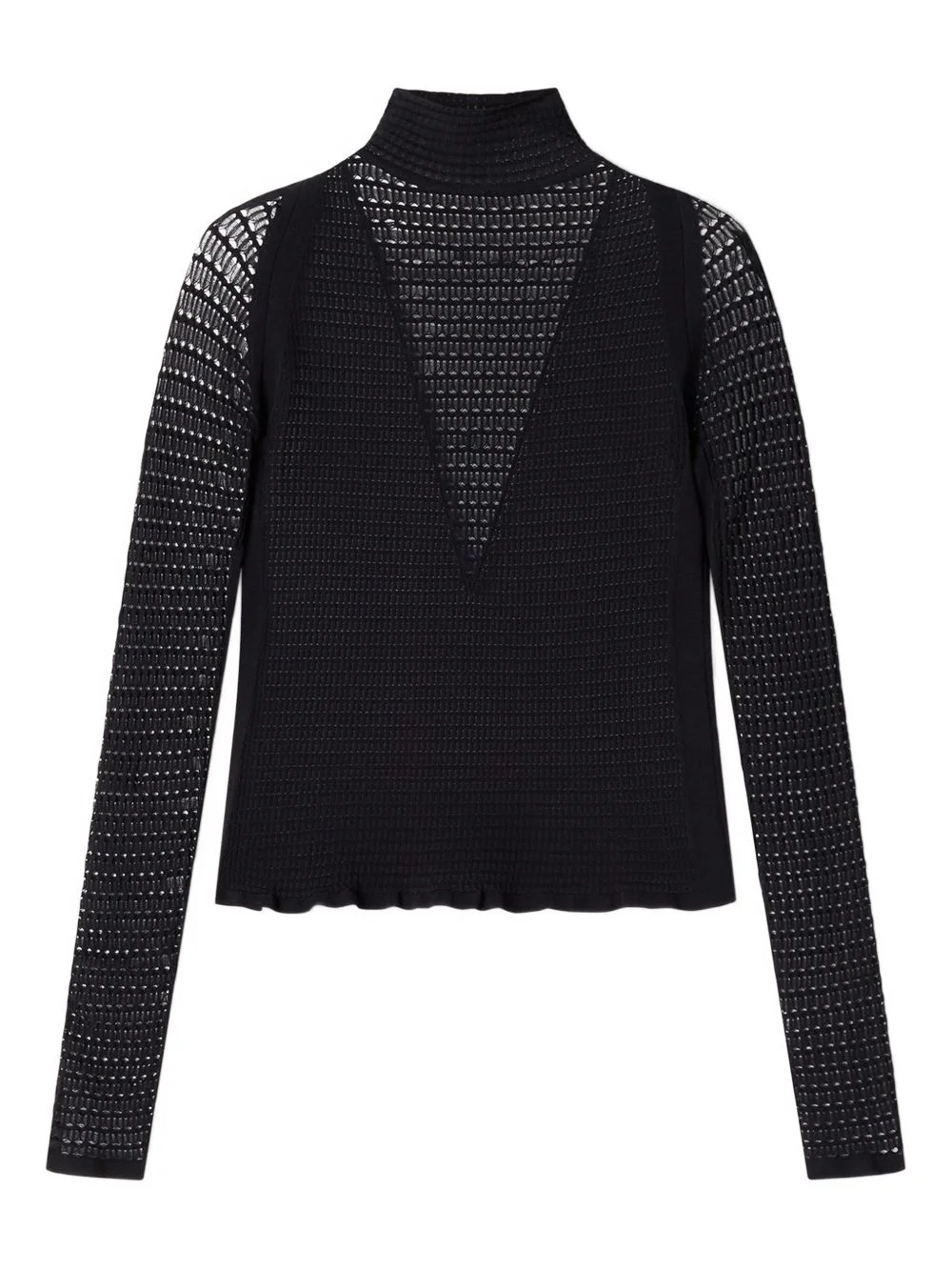 turtleneck long-sleeved sweater Highlights - Black - Openwork design - Turtleneck - Long sleeves - Ribbed detailing - Scalloped hem Imported Composition Viscose 46%, Polyamide 44%, Fabric 10% Washing instructions Read Manufacturer Guidelines